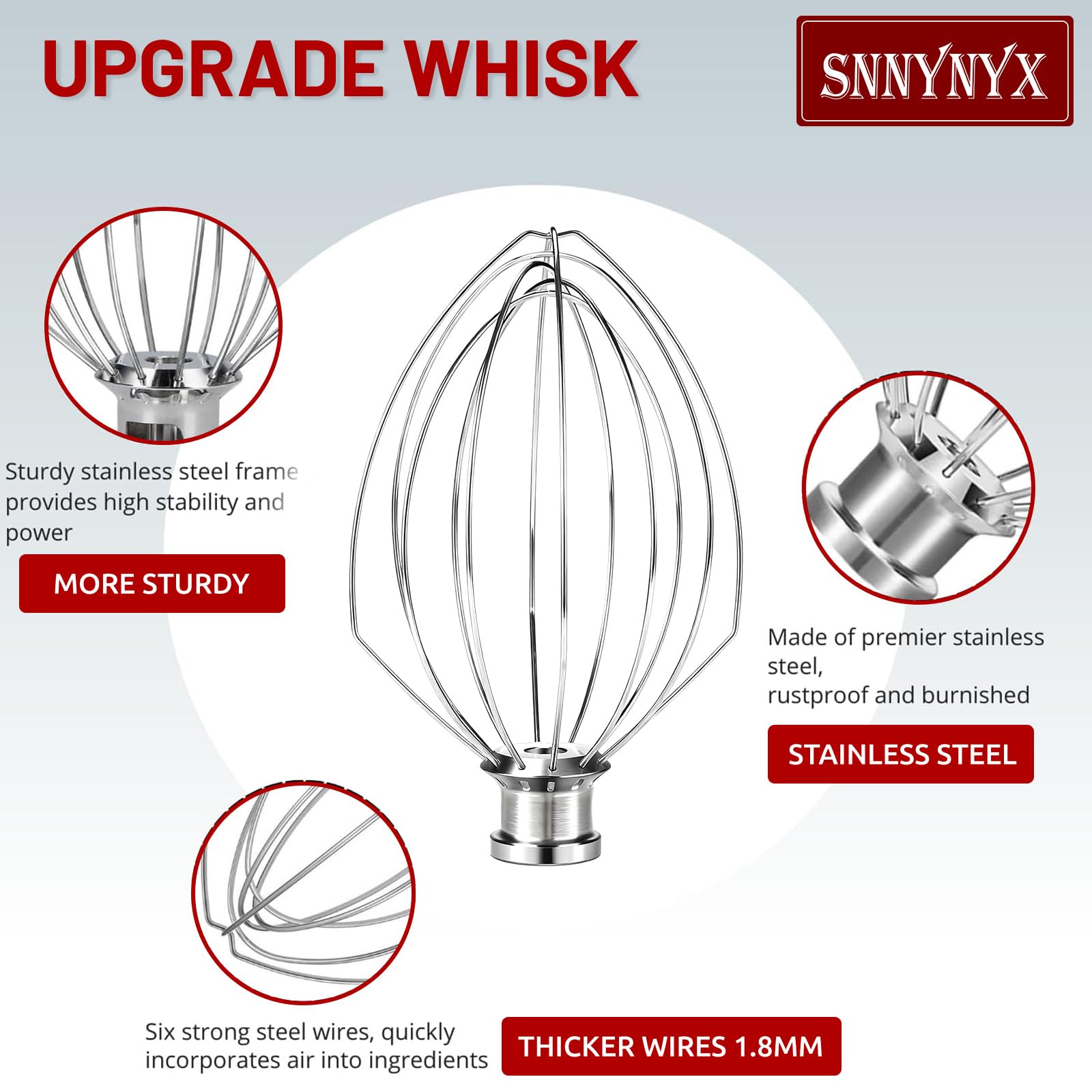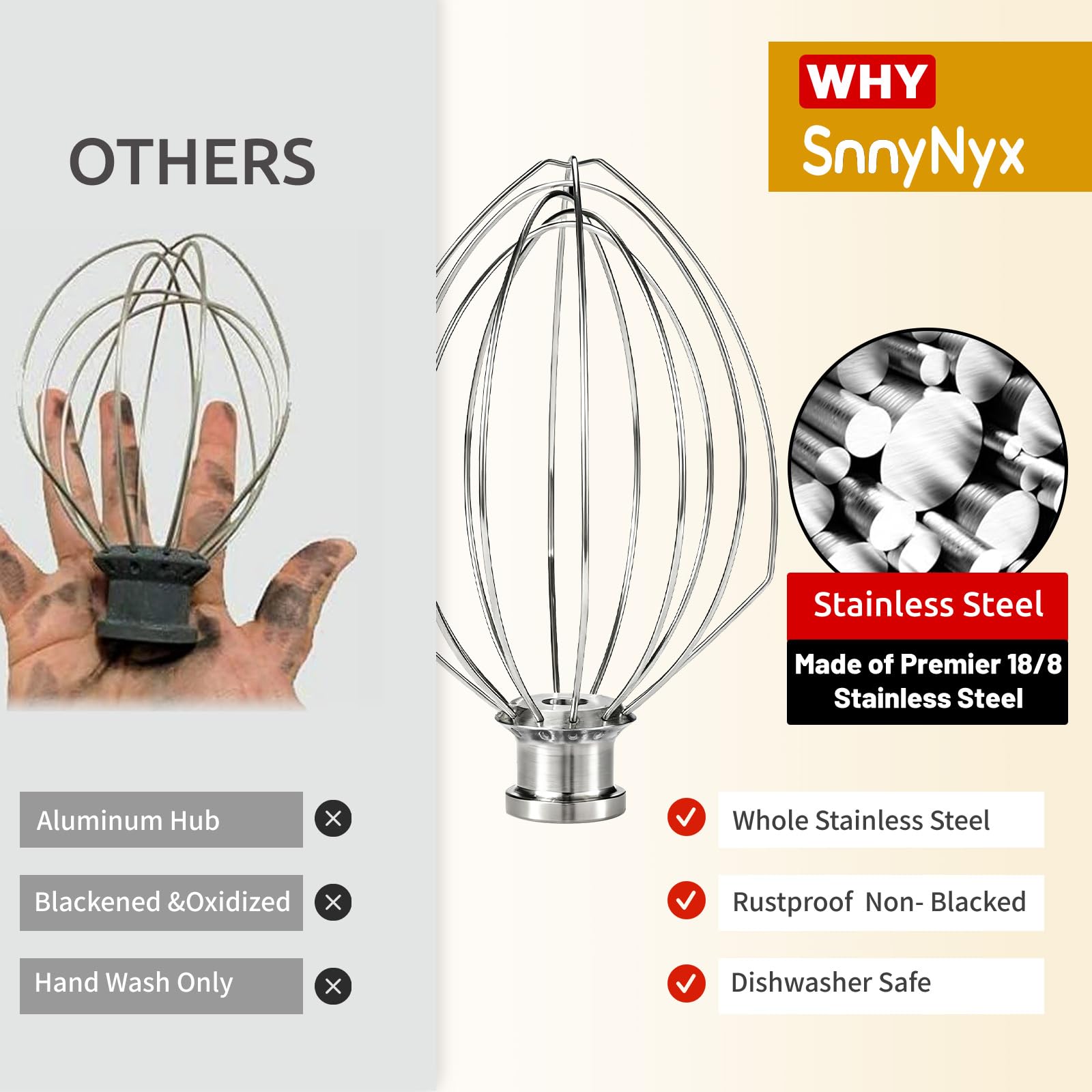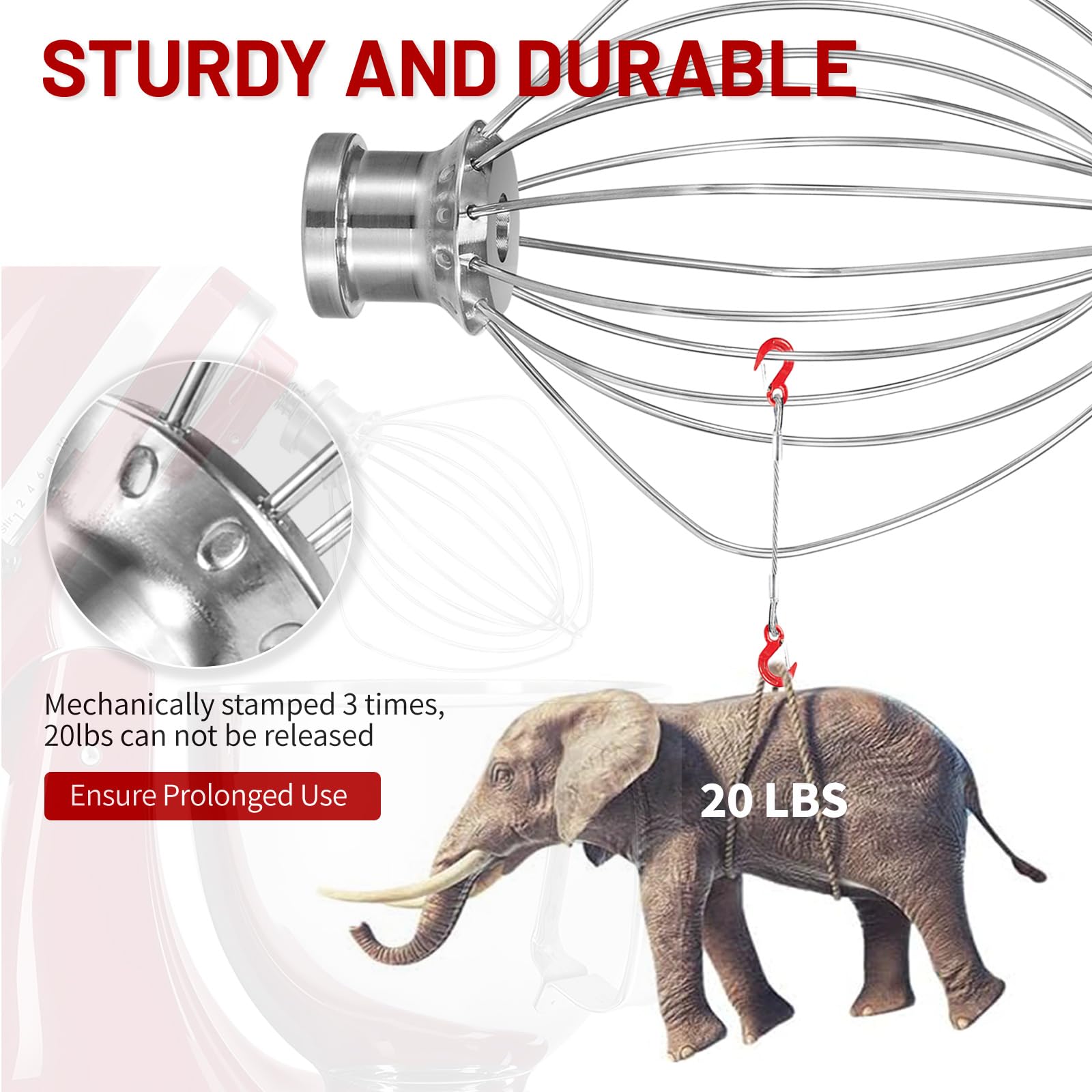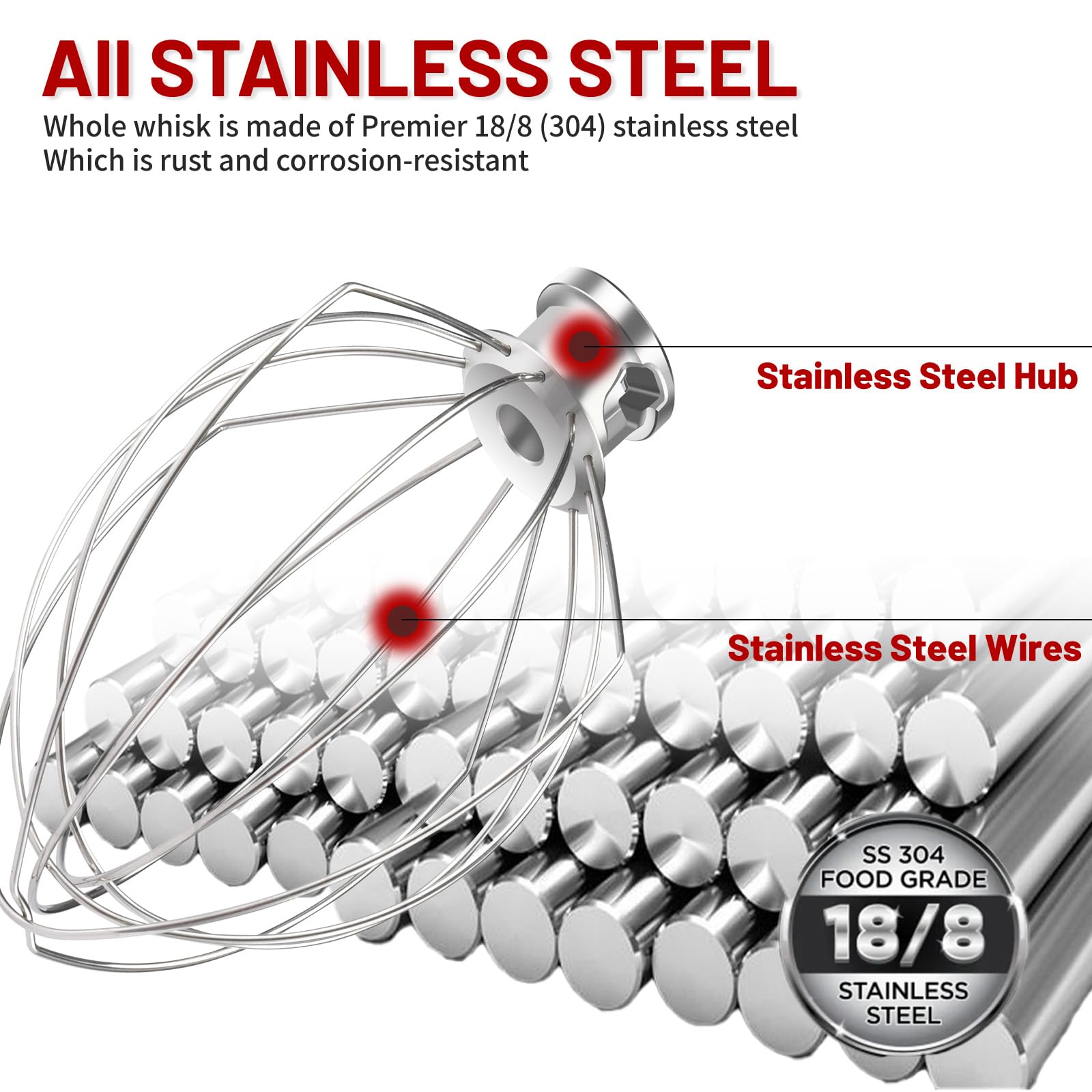 STURDY & DURABLE:The strong stainless steel wires are firmly stamped into the stainless steel hub, ensuring they won't loosen or fall out, no matter how fast your mixer spins.