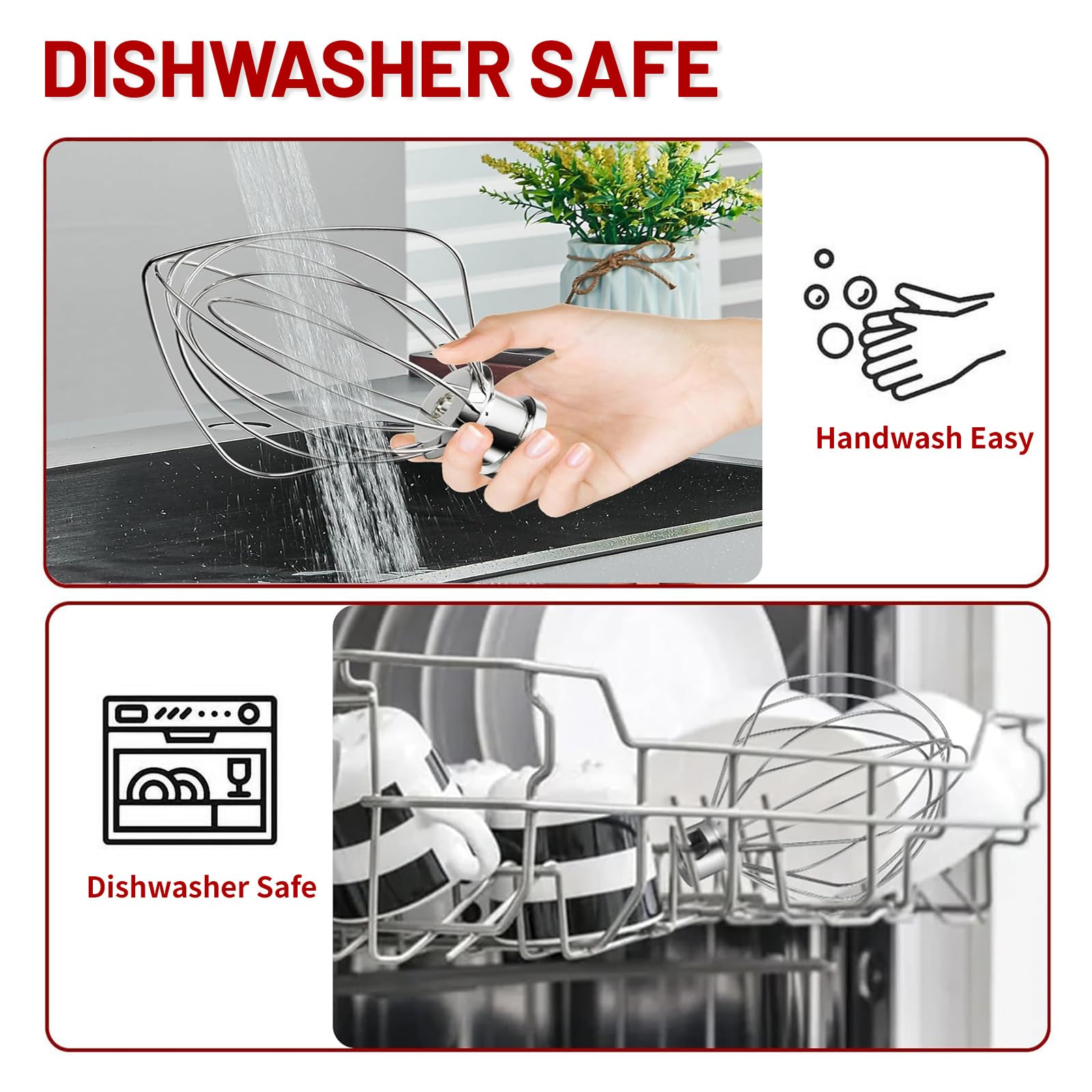 DISHWASHER SAFE:After mixing, simply toss the kitchenaid whisk attachment in the dishwasher for a fast, hassle-free cleanup. Spend more time enjoying your creations and less time cleaning.