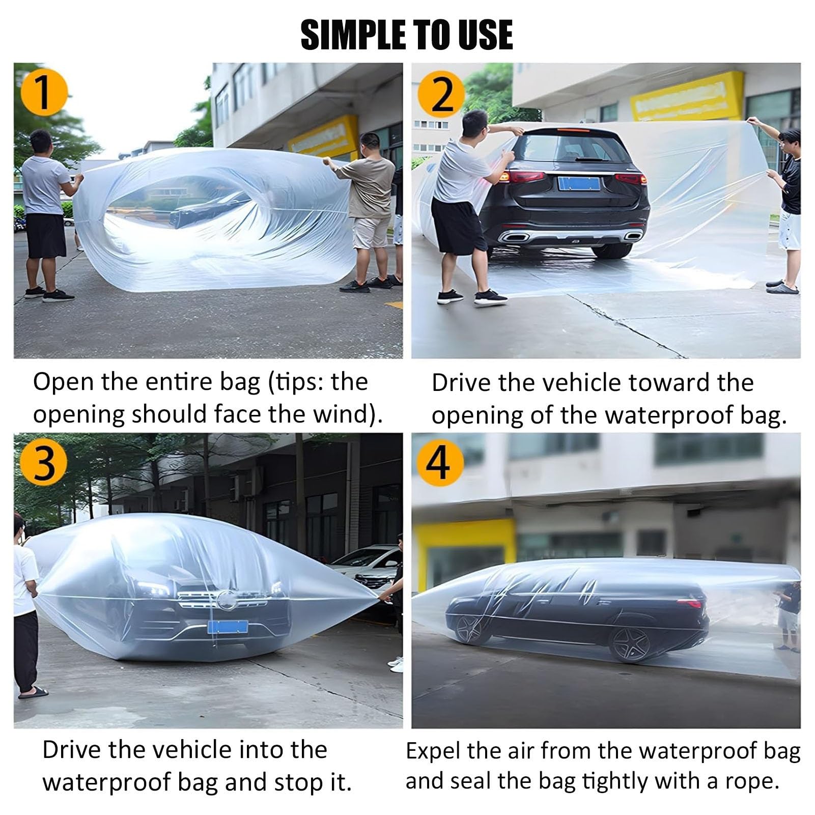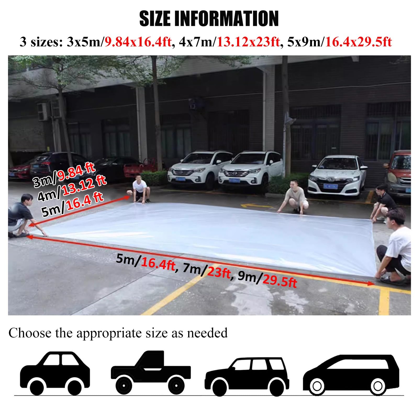 Easy to Use: Simply unfold the bag, drive your car inside, and exhaust the air before sealing it tightly with a rope. Lightweight and easy to store, it can be cleaned after use for multiple applications, with dimensions of 3x5m/9.84x16.4ft , 4x7m/13.12x23ft , 5x9m/16.4x29.5ft