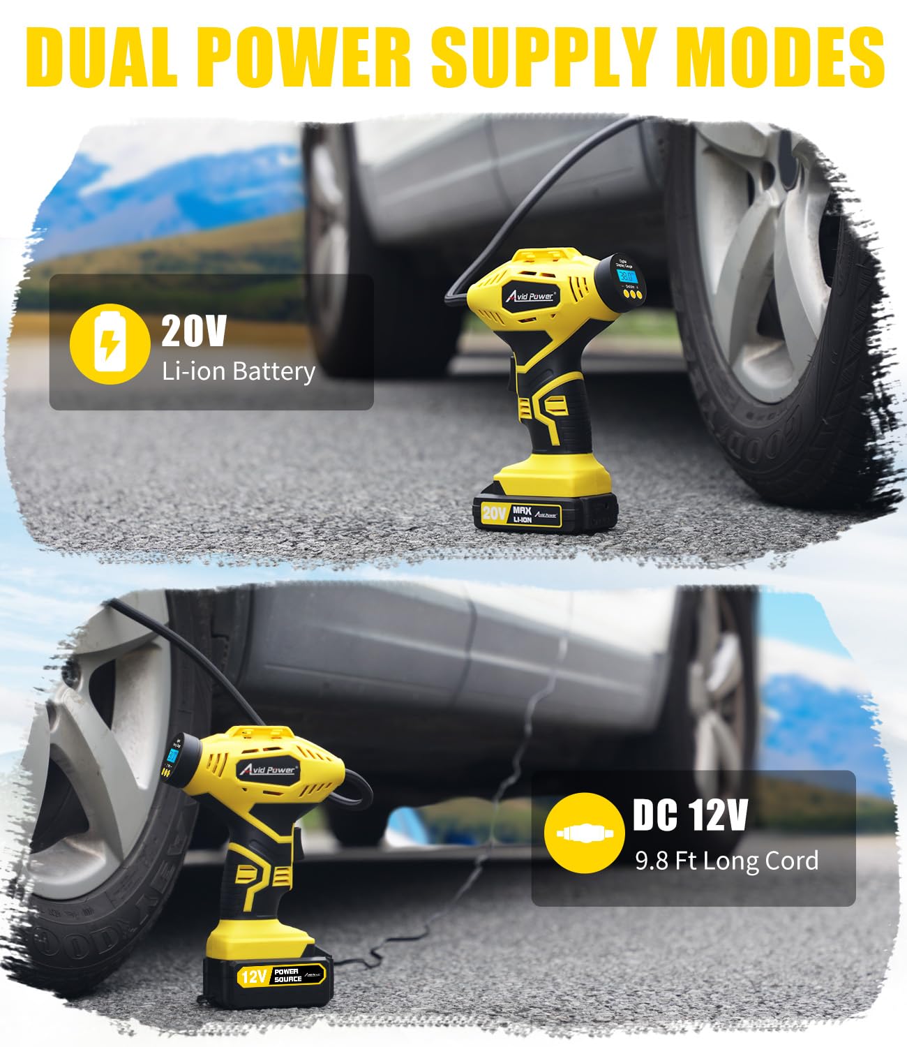 [Dual Power Compatibility] Includes a 20V rechargeable Li-ion battery (sufficient for 4 standard car tires, 195/60 R14) and a 12V DC car adapter for backup power. Never worry about running out of battery power on the road
