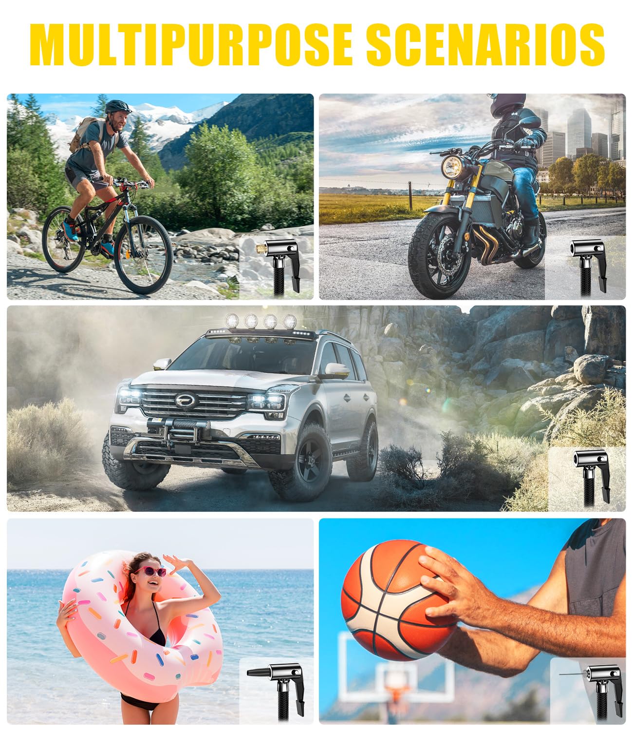 [Multipurpose] Rapidly inflates standard vehicles (tires up to 245mm wide or 50 PSI), bikes, motorcycles, sports balls, and small inflatables. Not suitable for commercial vehicles, trucks, large caravans, motor lorries, or high-volume inflatables