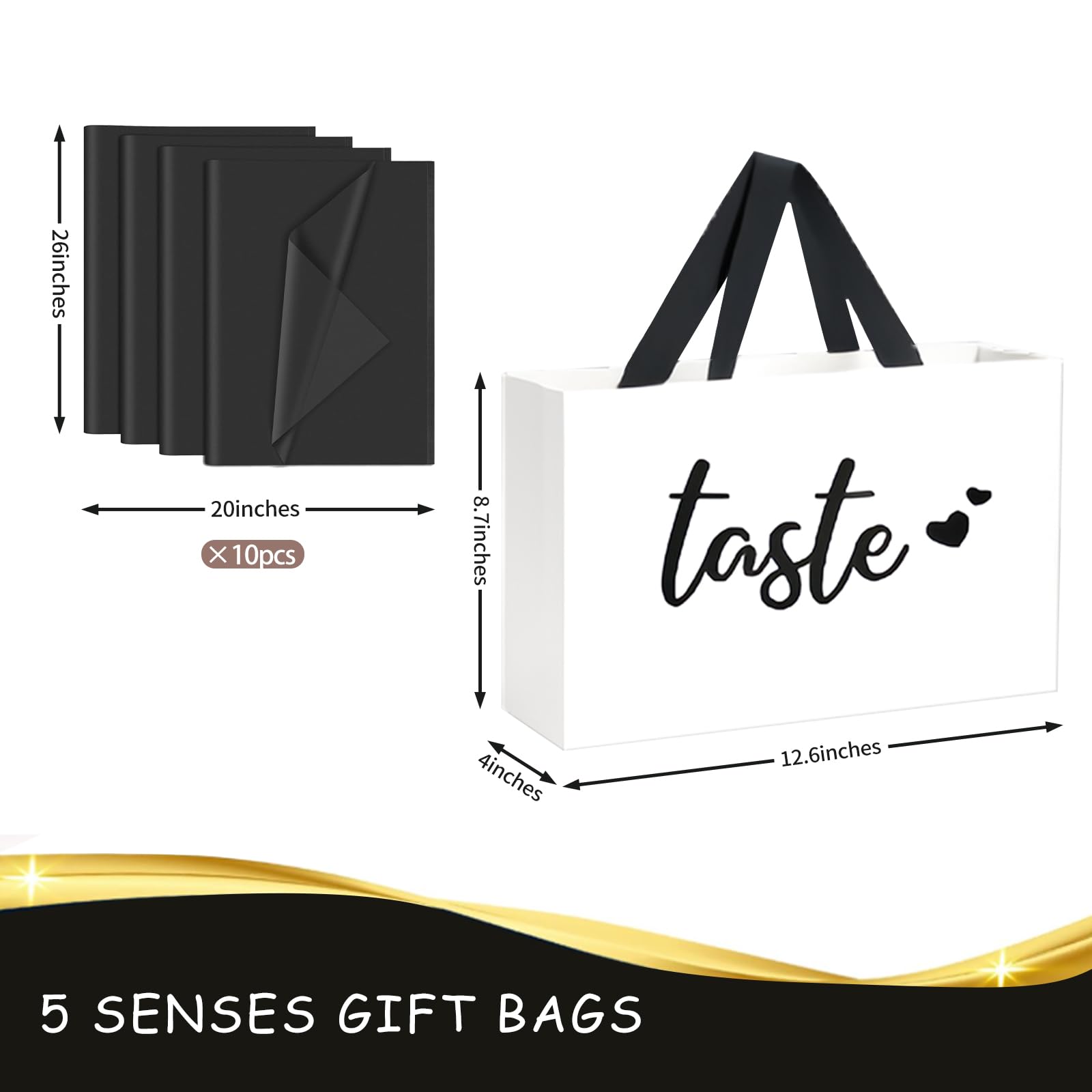 Package included: come with 5 senses gift bags designed with the words [Taste], [Touch], [Smell], [Sound] and [Sight], and 10 pieces of tissue paper, the perfect set for your "Five Senses" themed gift, and these 5 senses gift bags are a wonderful way to show your affection on birthdays, anniversaries, Valentine's Day or any occasion