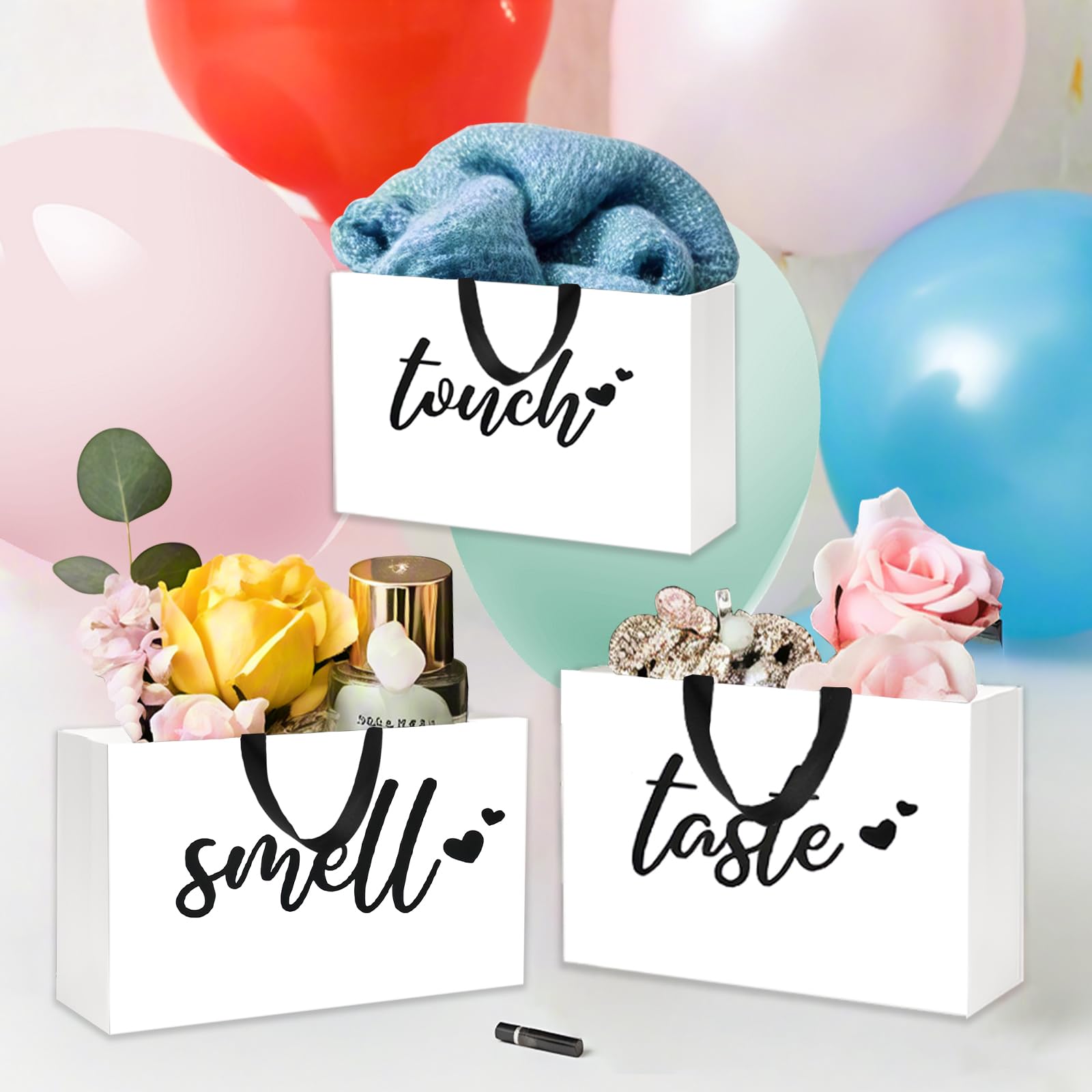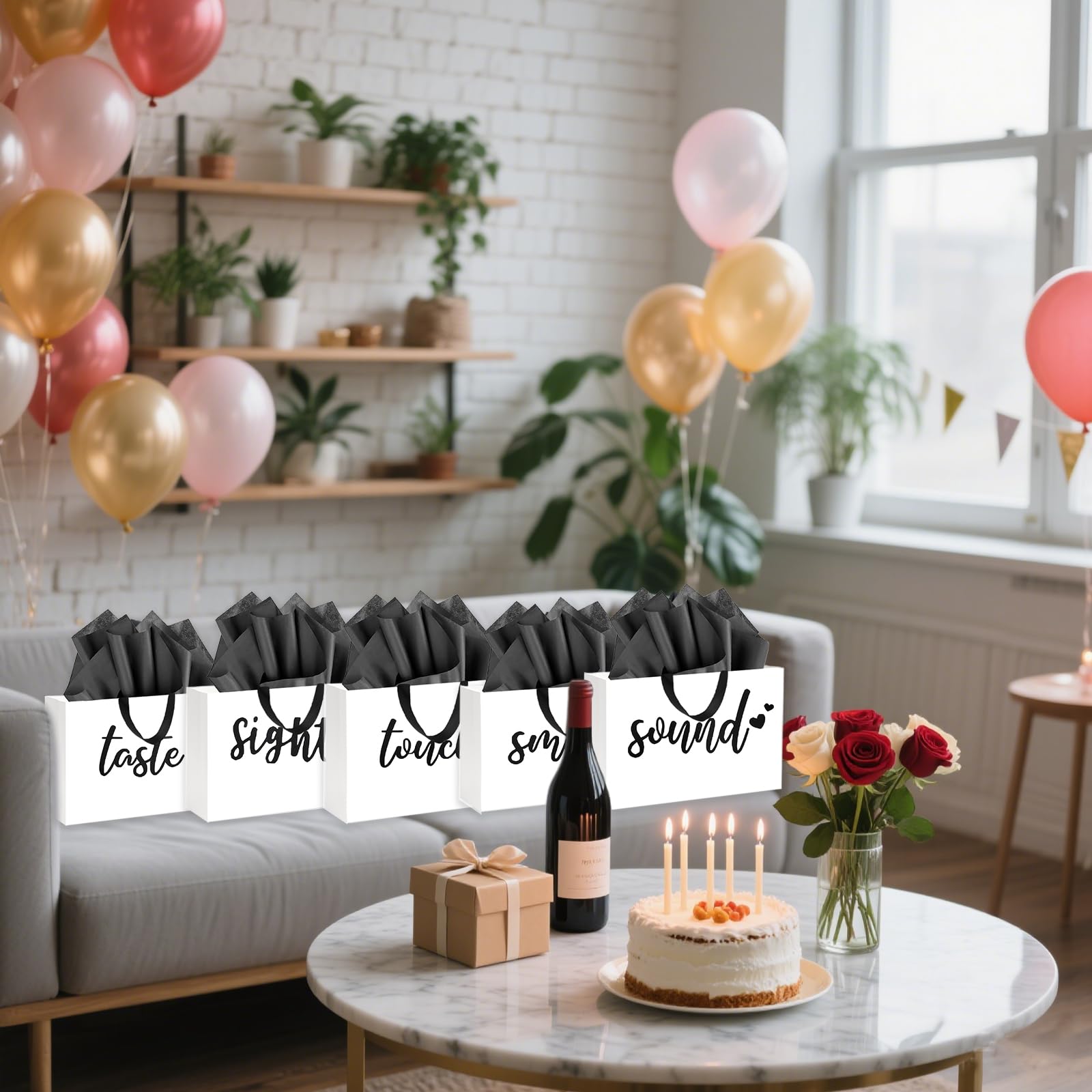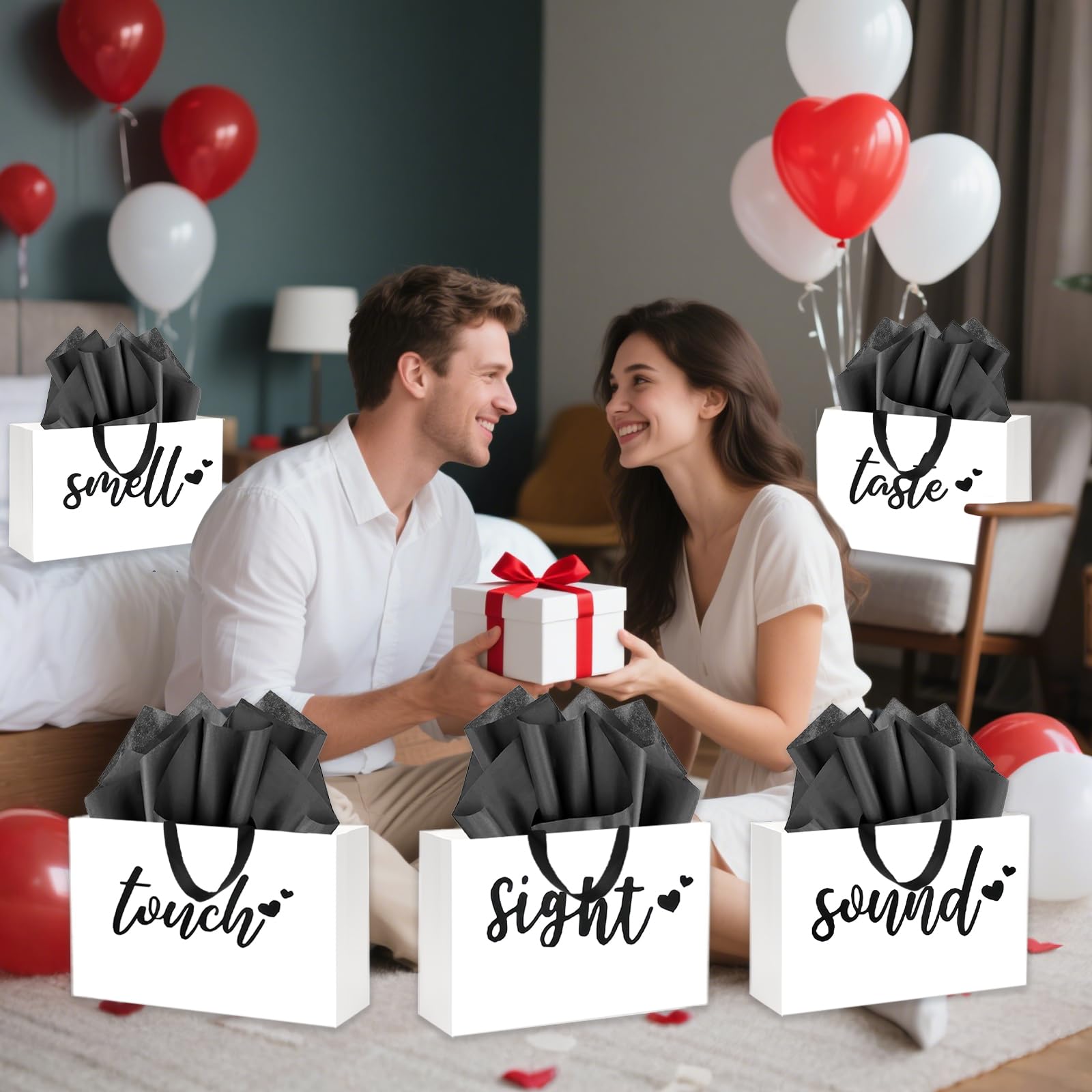 5 Senses Gift Bags Five Senses Gift Bags with Tissue Paper for Anniversary, Valentine's Day, Birthday Five Senses Gift Bags for Him Husband Boyfriend Features: These 5 senses gift bags add a unique and personal touch to your presents, allowing you to convey your sentiments through each of the five senses. Whether you're celebrating a birthday, anniversary, or any special occasion, these bags are the perfect way to show how much you care Specification: Material: thick cardboard paper Color: as the picture shown Quantity: 5 Pieces in total Package Content: 5 x gift bags NOTE: Please allow 1 - 2 mm error due to the hand measurement