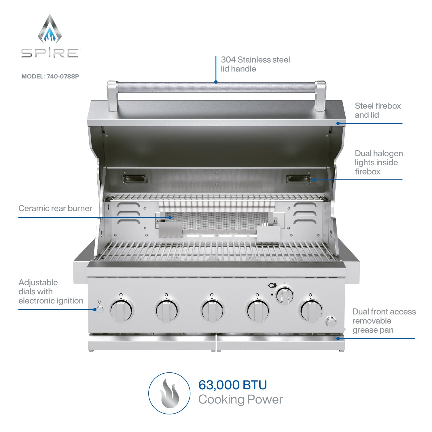 5 High-Output 10,000 BTU Burners: Designed with five 10,000 BTU burners, this patio grill heats up quickly, ensuring rapid cooking for all your favorite grilled dishes. Whether you're cooking for a crowd or a family, cook without any delays