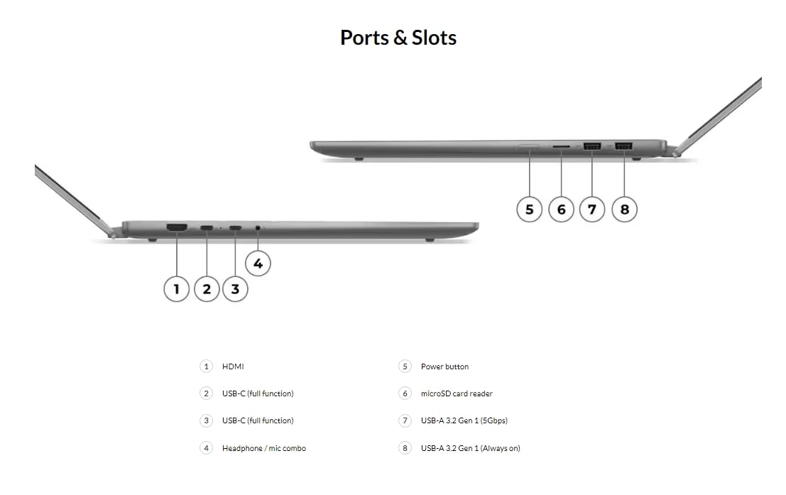 Processor: AMD Ryzen 7 8845HS Processor (3.80 GHz to 5.10 GHz) Memory: 16 GB LPDDR5X-5200MHz (Soldered) Storage: 1 TB SSD M.2 2242 PCIe Gen4 TLC Display: Touchscreen, 14" WUXGA (1920 x 1200), IPS, Glare, 45%NTSC, 300 nits, 60Hz Camera: 1080P FHD with Dual Microphone and Privacy Shutter Battery: Integrated 57Wh Fingerprint Reader Lenovo Digital Pen 2 Included Connectivity: Wi-Fi 6 2x2 AX and Bluetooth 5.3 Graphics: Integrated AMD Radeon 780M Keyboard: Backlit, Storm Grey - English (US) QWERTY Docking: Various docking solutions supported via USB-C Ports: 1x USB-A (USB 5Gbps / USB 3.2 Gen 1) 1x USB-A (USB 5Gbps / USB 3.2 Gen 1), Always On 2x USB-C (USB 10Gbps / USB 3.2 Gen 2), with USB PD 3.1 and DisplayPort 1.4 1x HDMI 1.4b 1x Headphone / microphone combo (3.5mm) 1x microSD card reader Dimensions: 12.32 x 8.94 x 0.70 inches Weight: Approximately 3.6 lbs Color: Luna Grey Operating System: Windows 11 Home 64