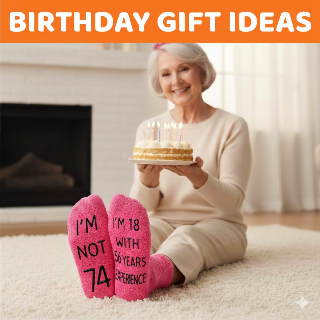 GIFTS FOR WOMEN IN THEIR 74S: Say it with socks - "I'M NOT 74, I'M 18 WITH 56 YEARS EXPERIENCE." These are suitable for any holiday gifts, such as Birthday gifts, White Elephant gifts, Christmas gifts, Mothers Day gifts.