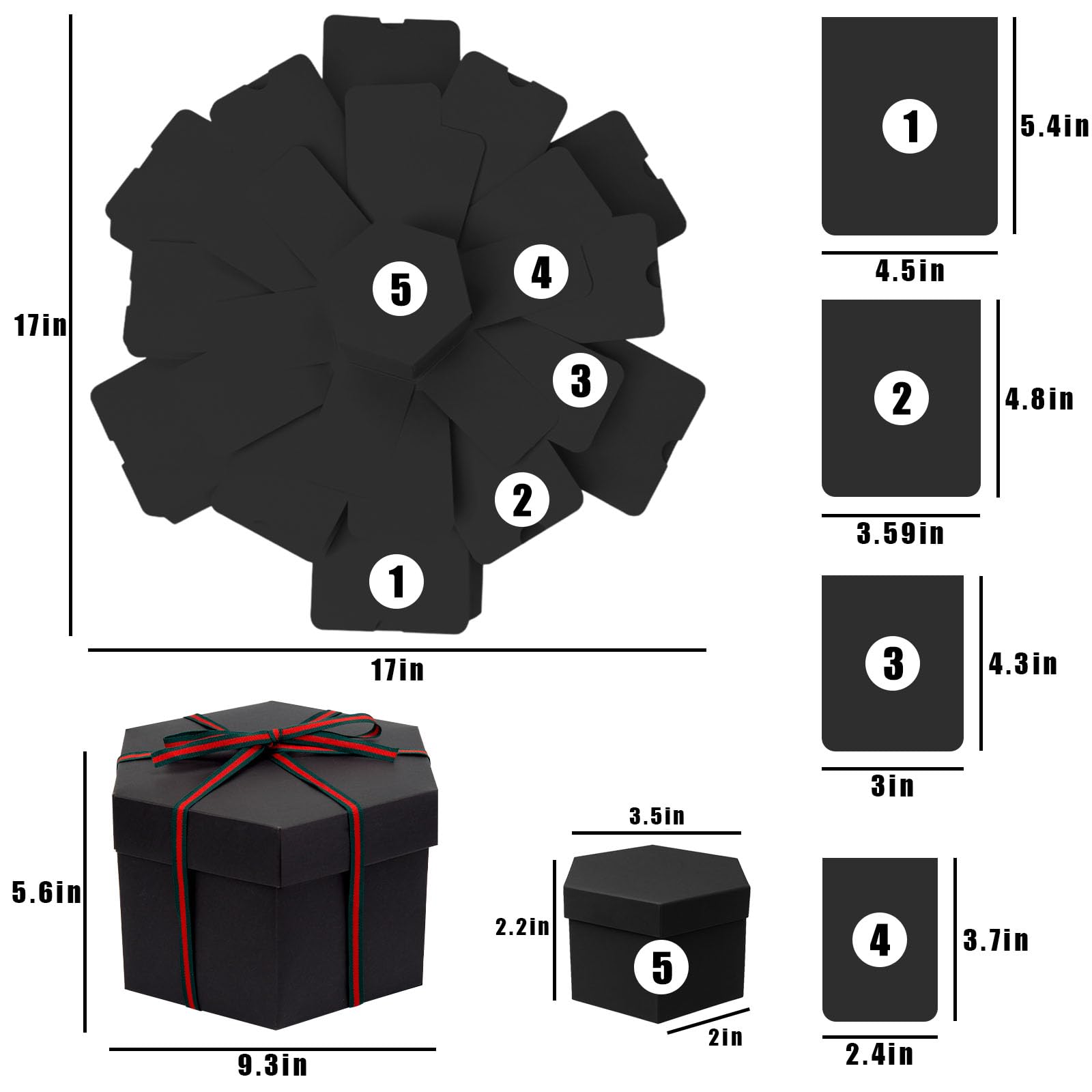 VARIOUS SIZES - The explosion gift box is 17 x 17inch when unfolded and 9.3 x 5.6inch when folded. The smallest gift box is 3.5 x 2.2inch. Sizes for photos in each layer: the innermost layer: 3.7 x 2.4inch, the second layer: 4.3 x 3inch, the third layer: 4.8 x 3.59inch, and the fourth layer: 5.4 x 4.5inch.