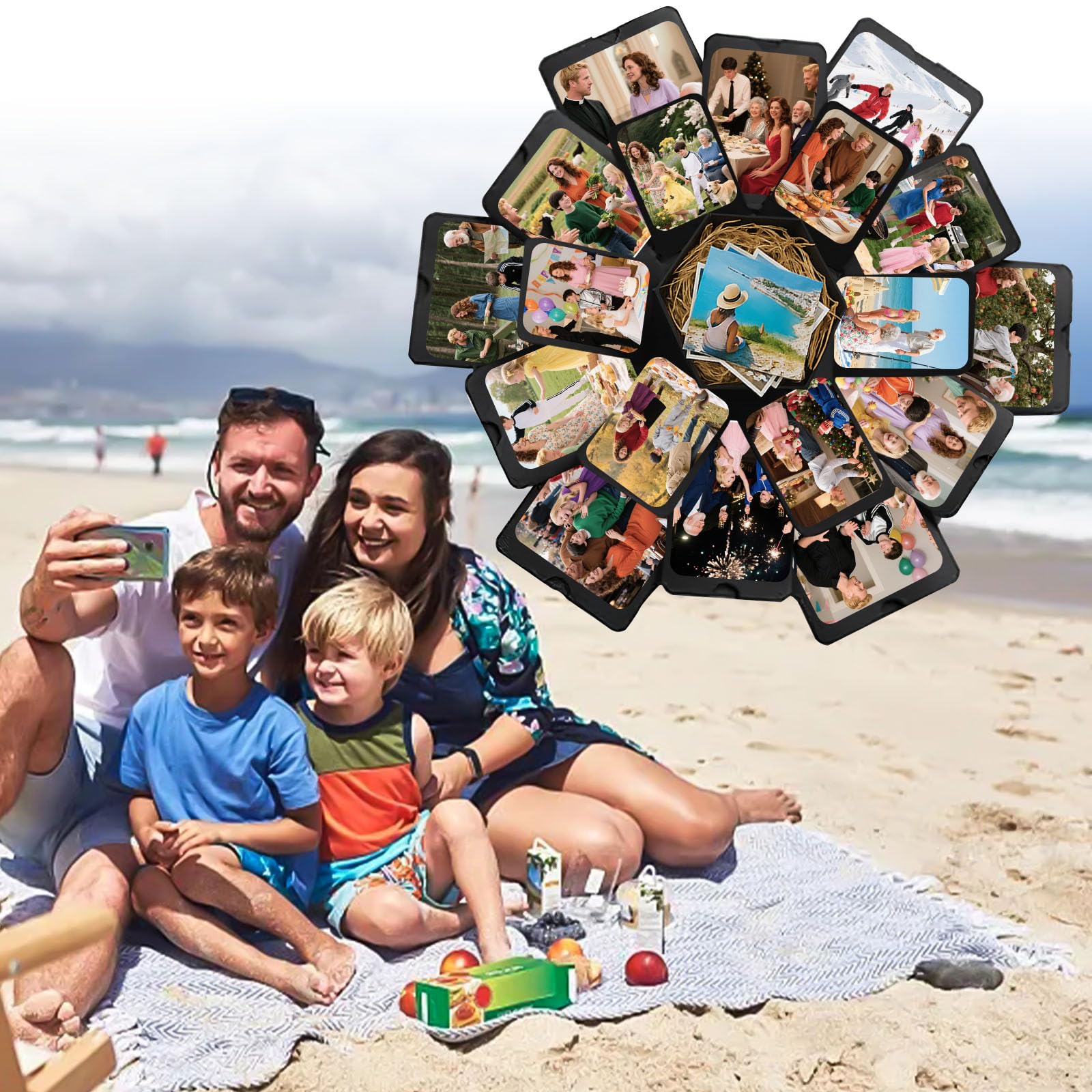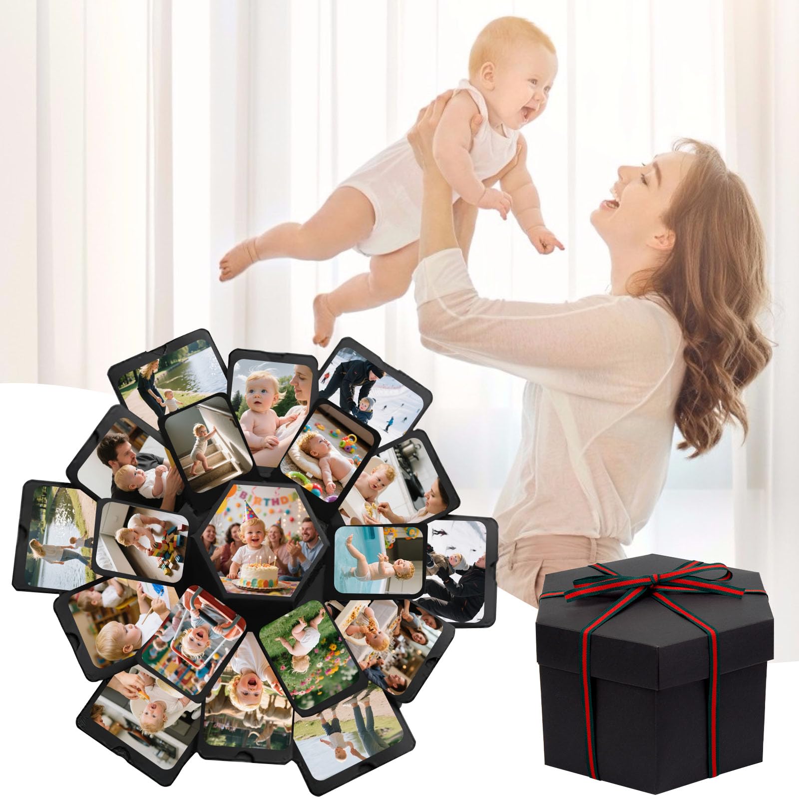 CREATIVE EXPLOSION GIFT BOX - You'll find a super surprise when this black gift box opens. 4 layers of cards will explode. You can paste cherry-picked photos on every layer, up to 36 pieces. The smallest gift box can hold gifts like rings, lipstick, necklace, watch, earrings, chocolates, perfume, etc., creating an unforgettable memory for your loved ones.