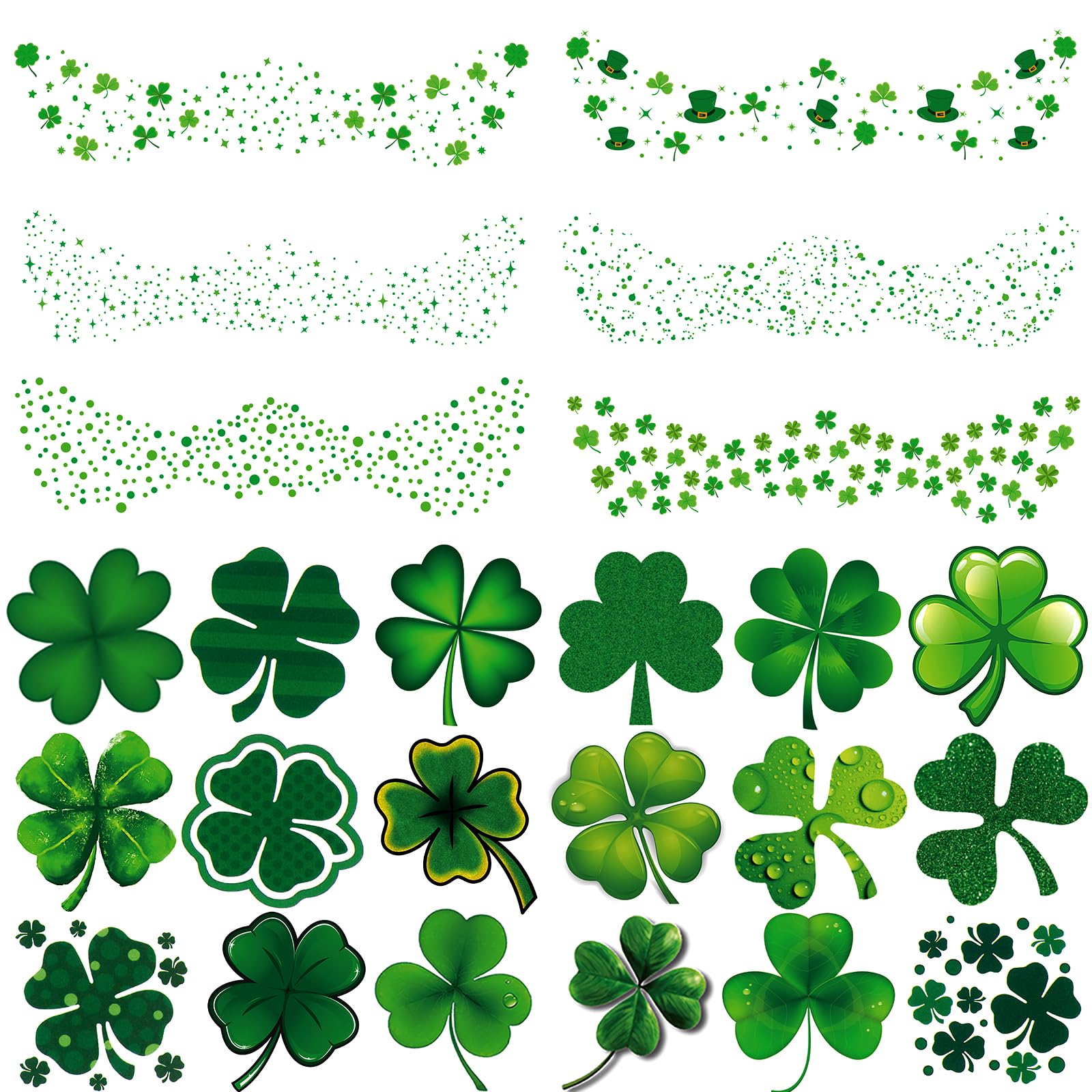 MORE SHEETES: 24 sheets St Patricks Day freckles face tattoos stickers, Includes two different sizes, 6 sheets freckles face St. Patrick's Day tattoos , and 18 sheets lucky clover shamrock tattoos.