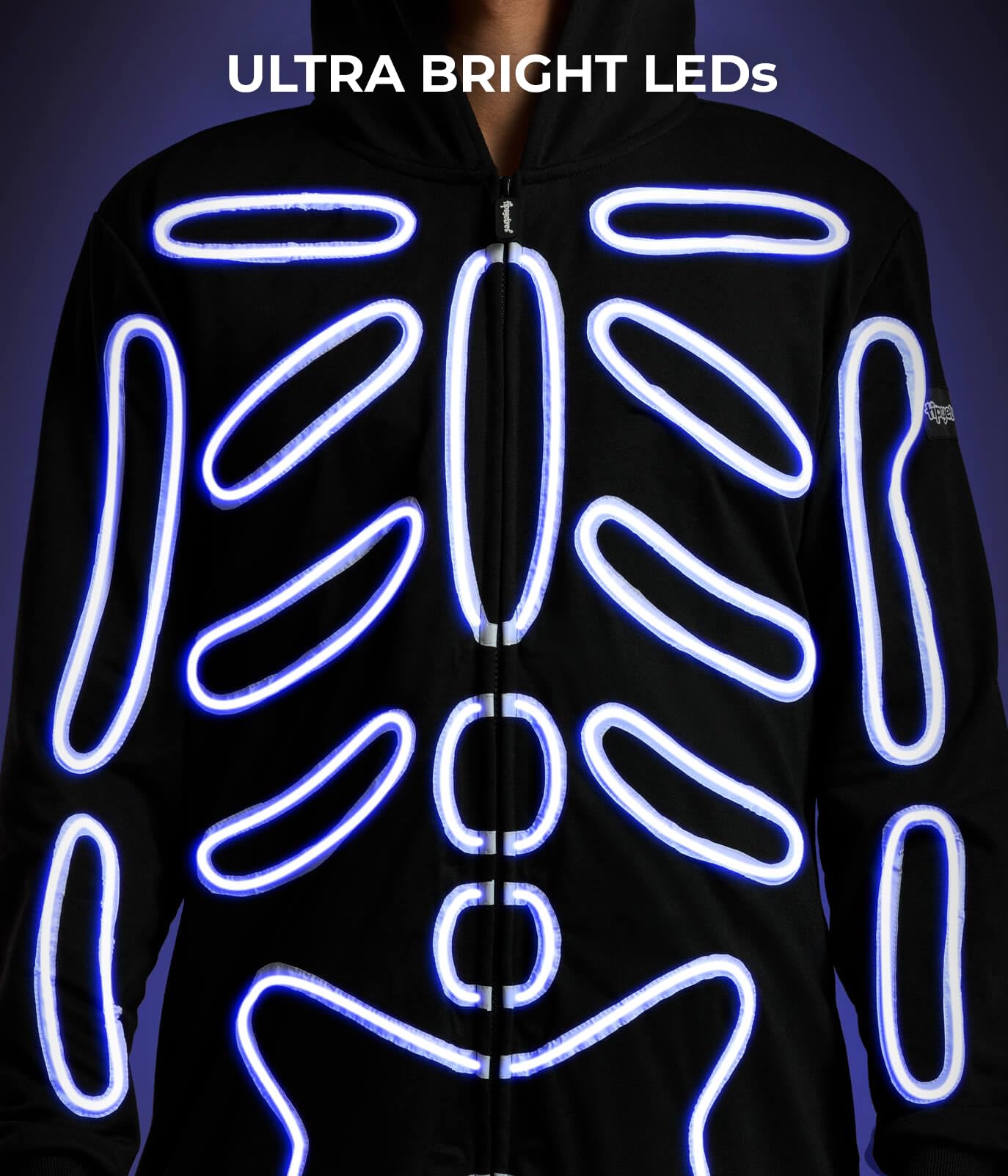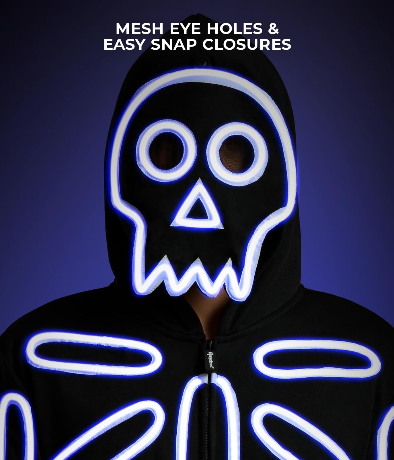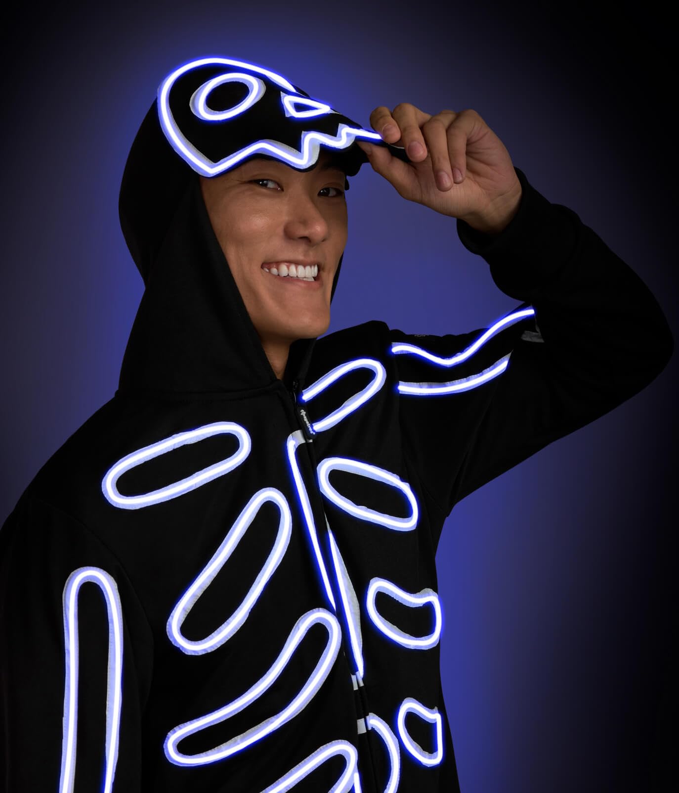 CONVENIENT POCKETS Unlike most men’s skeleton costumes, this LED skeleton jumpsuit features secure zippered pockets to stash your phone, wallet, or essentials so you can party hands-free
