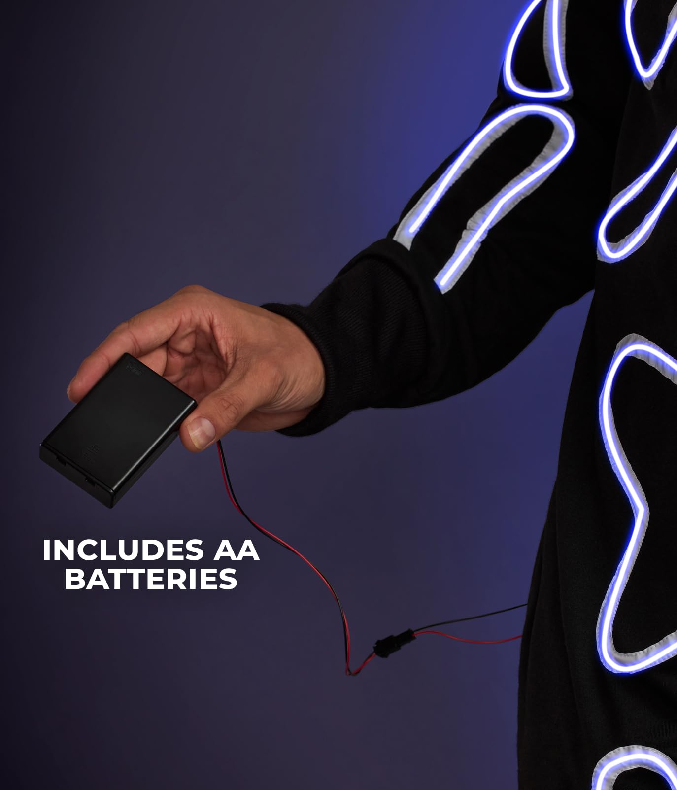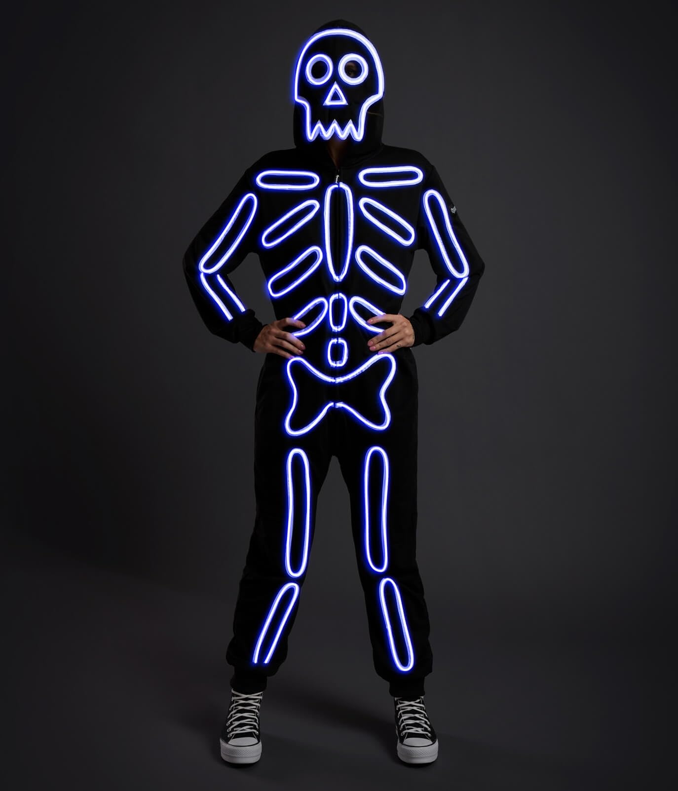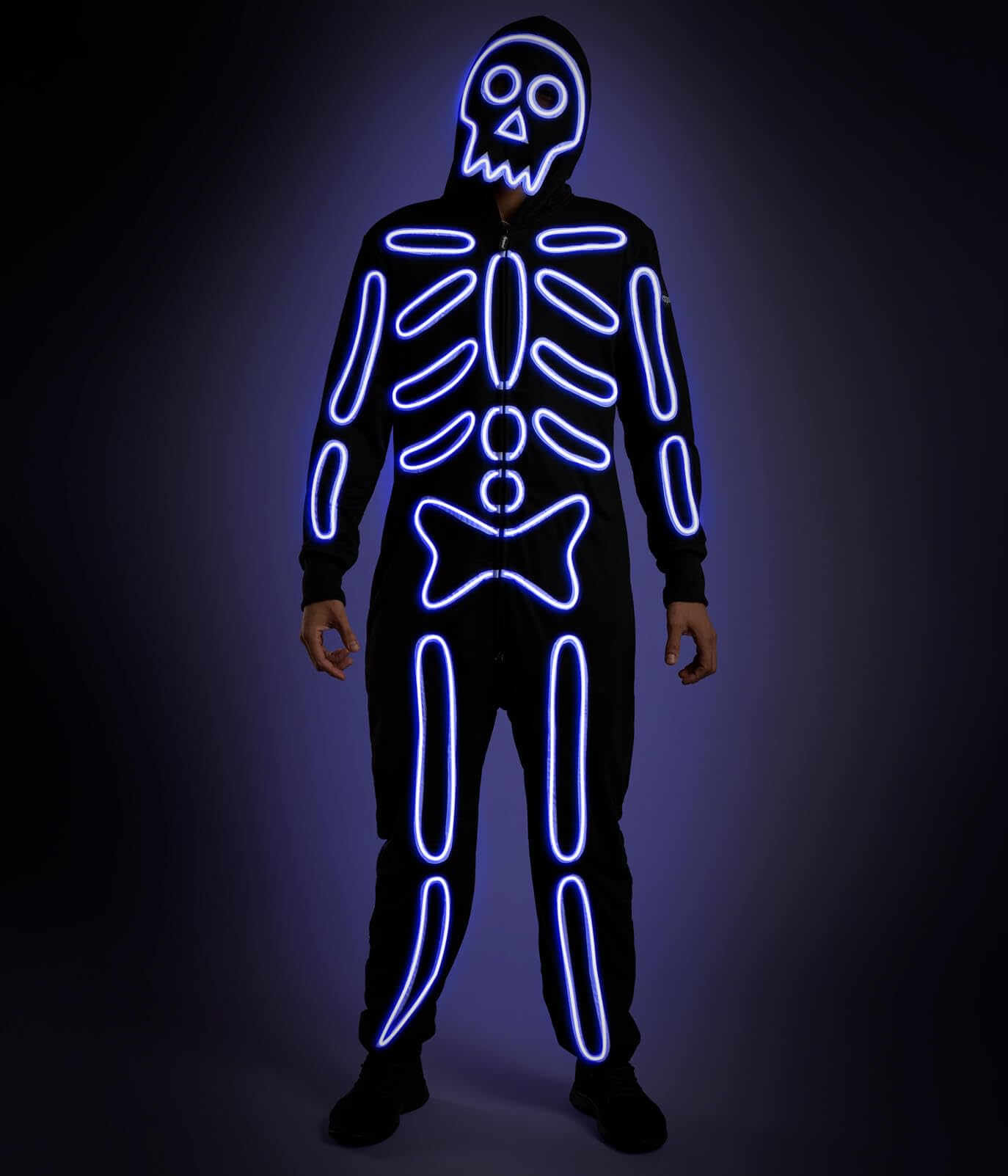 FULL LED DESIGN Stand out in this Tipsy Elves Men’s Skeleton Halloween Costume. The glowing LED rope light skeleton jumpsuit includes AA batteries, so this light up Halloween costume is ready for parties, haunted houses, or trick-or-treating.