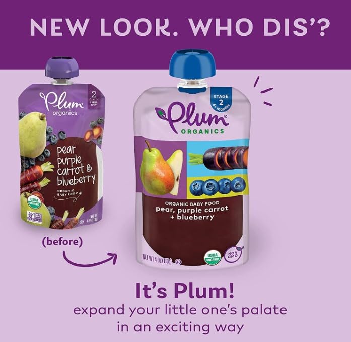 Baby Food for your Little Foodie. Plum Organics Stage 2 (6+ months) organic baby food pouches are made with blends of fruits, veggies, and ingredients that are perfect for exposing your little foodie to unique flavors, textures, and colors. Our Pear, Purple Carrot, and Blueberry blend is made with non-GMO, organic ingredients for organic baby food that your baby will love. Plum Organics pouches are naturally preserved, unsalted, unsweetened, and kosher parve. And since our baby food pouches are convenient, portable, and resealable, you can customize portion sizes, whether you're at home or you need a simple snack on the go.