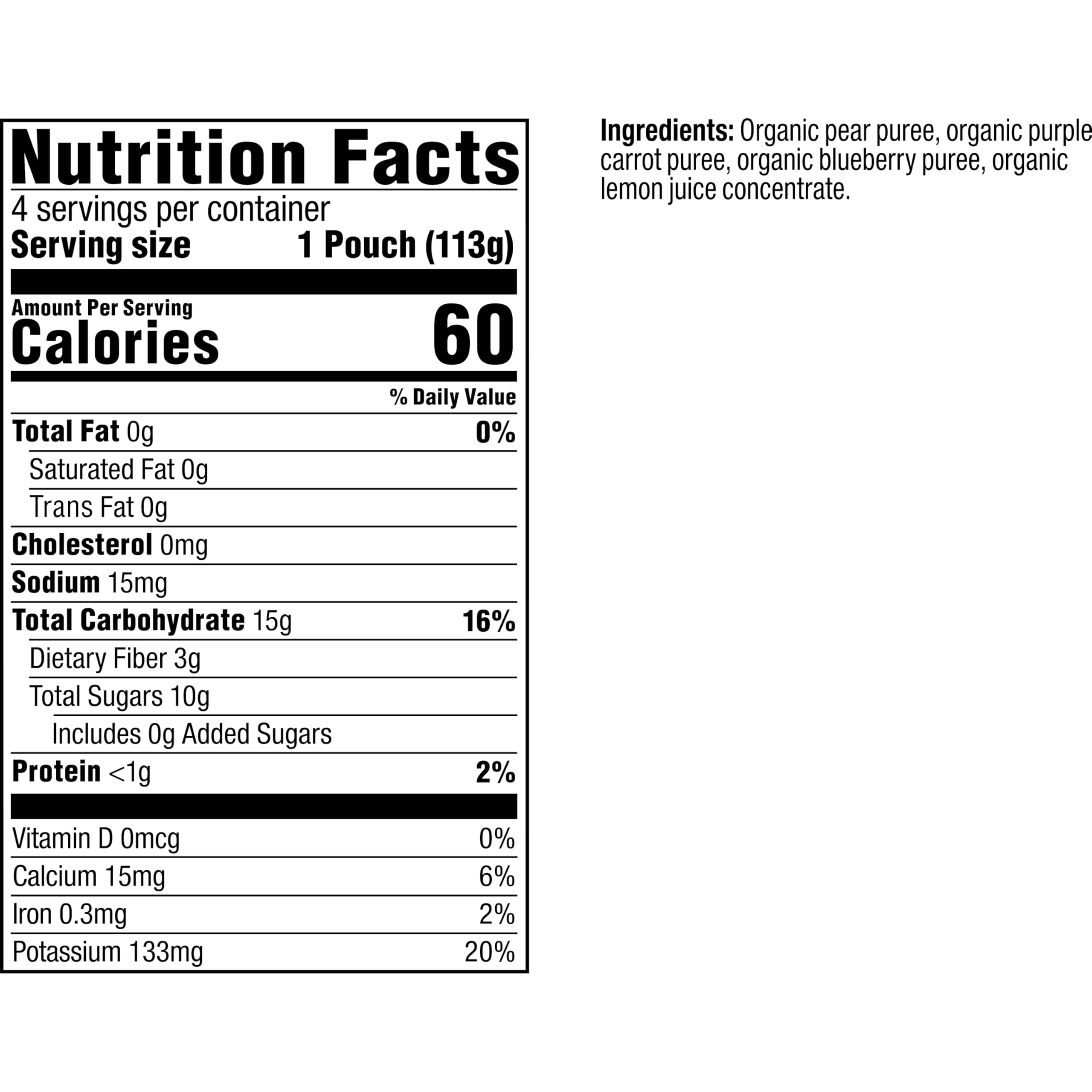 MADE WITH NATURAL FLAVORS: Contains organic pear puree, organic purple carrot puree, organic blueberry puree, and organic lemon juice concentrate