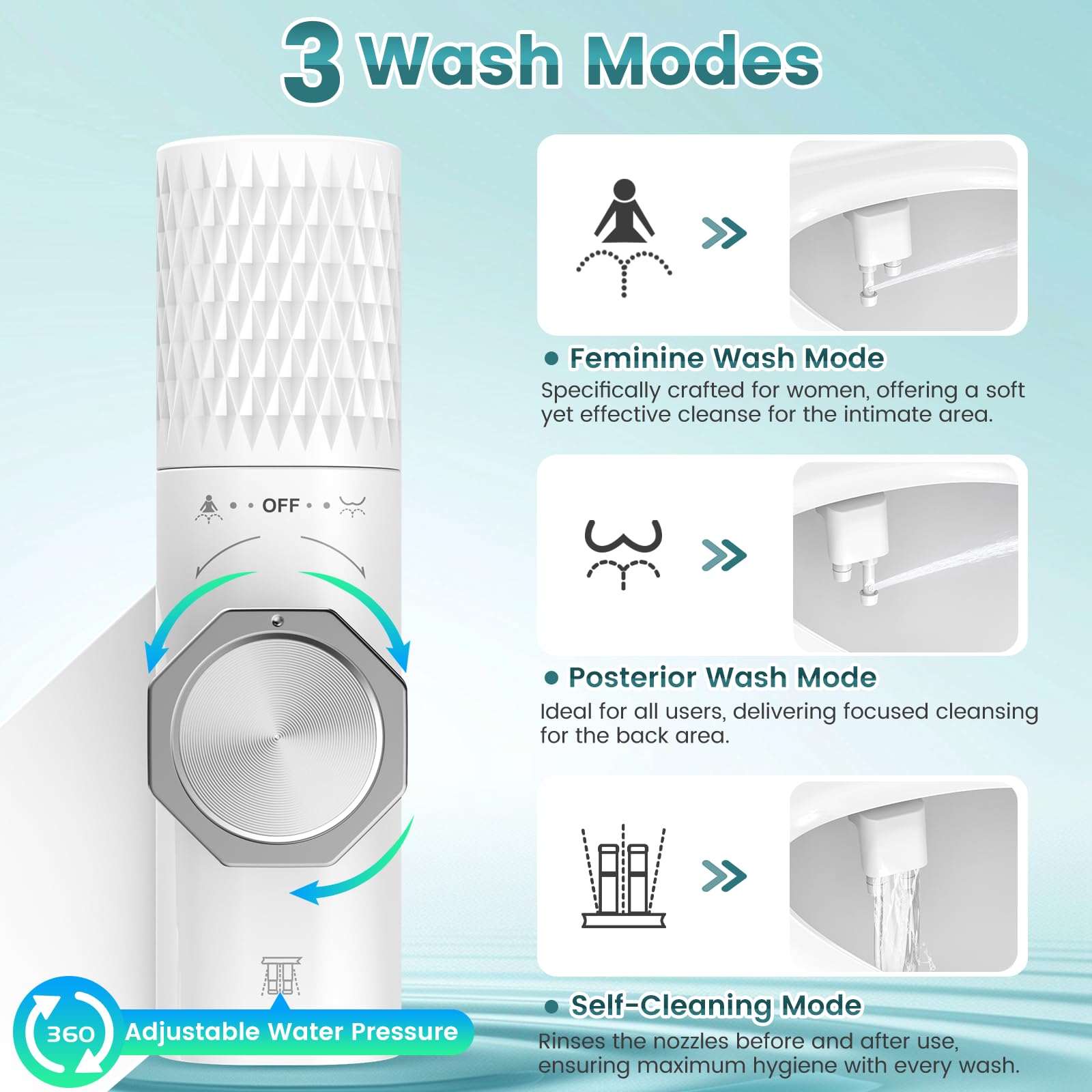 [Dual Spray Nozzles with Self-cleaning for Existing Toilets]The bidet attachment features dual nozzles with two targeted spray modes: rear wash and feminine wash. A simple turn of the knob switches between functions, making it ideal for different personal needs. For added cleanliness, the bidet includes a self-cleaning nozzle system. After each use, the nozzles automatically retract behind a protective guard, ensuring lasting hygiene and reliability.