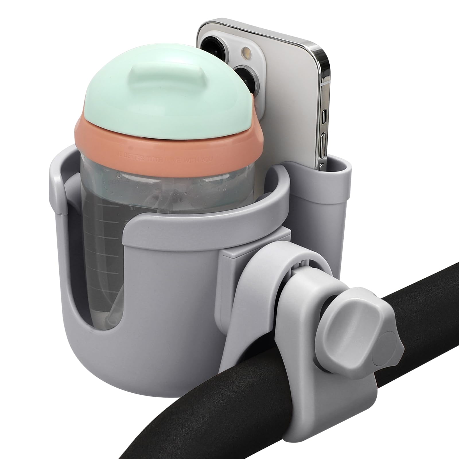 This 2-in-1 stroller cup holder with a phone holder, it can load drinks bottles and cell phone at the same time. You can see new messages, incoming calls in the first time when you are pushing a stroller or running on a treadmill. It is applicable to most cell phones on the market.