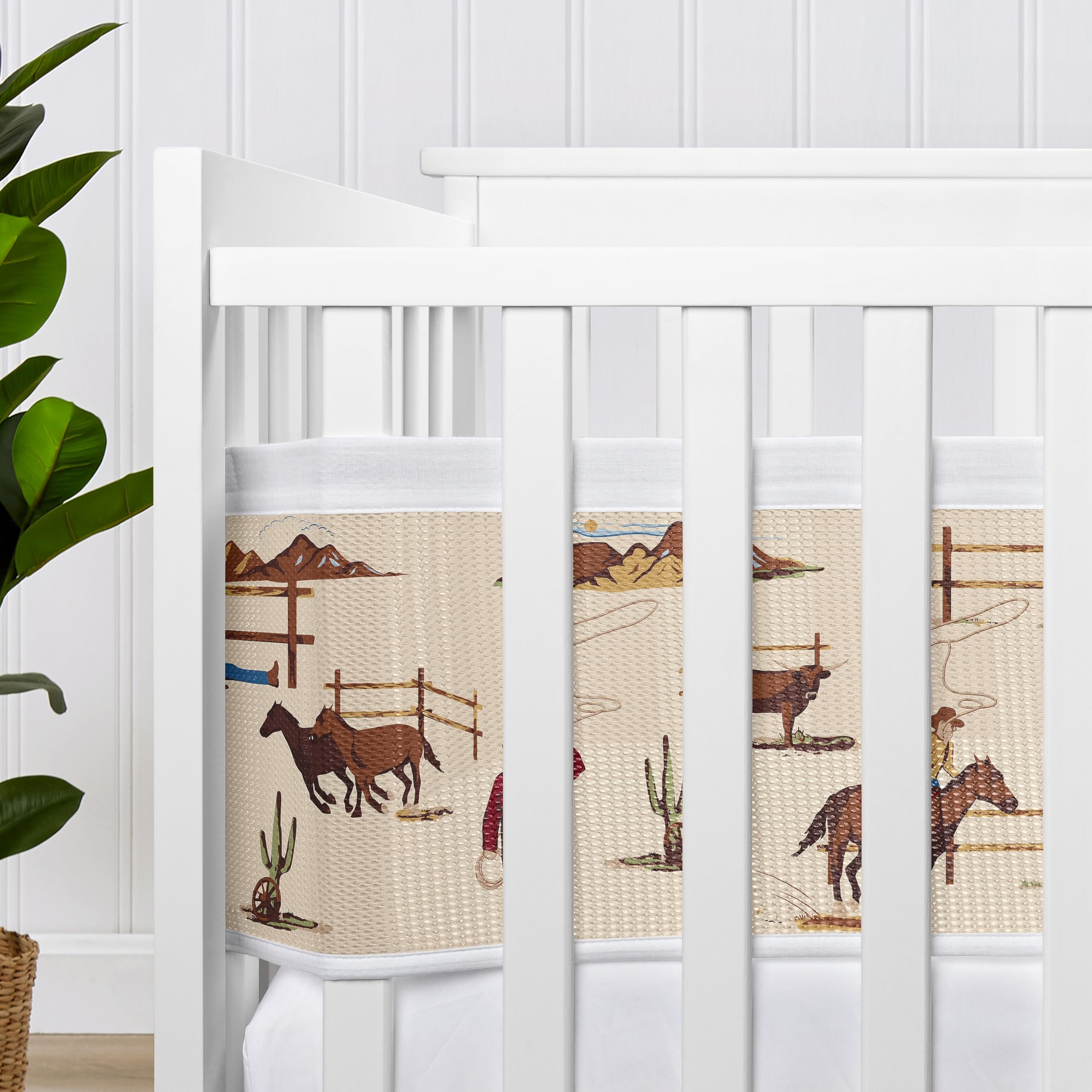 This mesh crib liner features a southern charm country south wild west steer animal cow western cowboy print with complimentary color palette from the matching Sweet Jojo Designs Wild West bedding collection of chocolate brown, tan, neutral, cream, red white and blue.