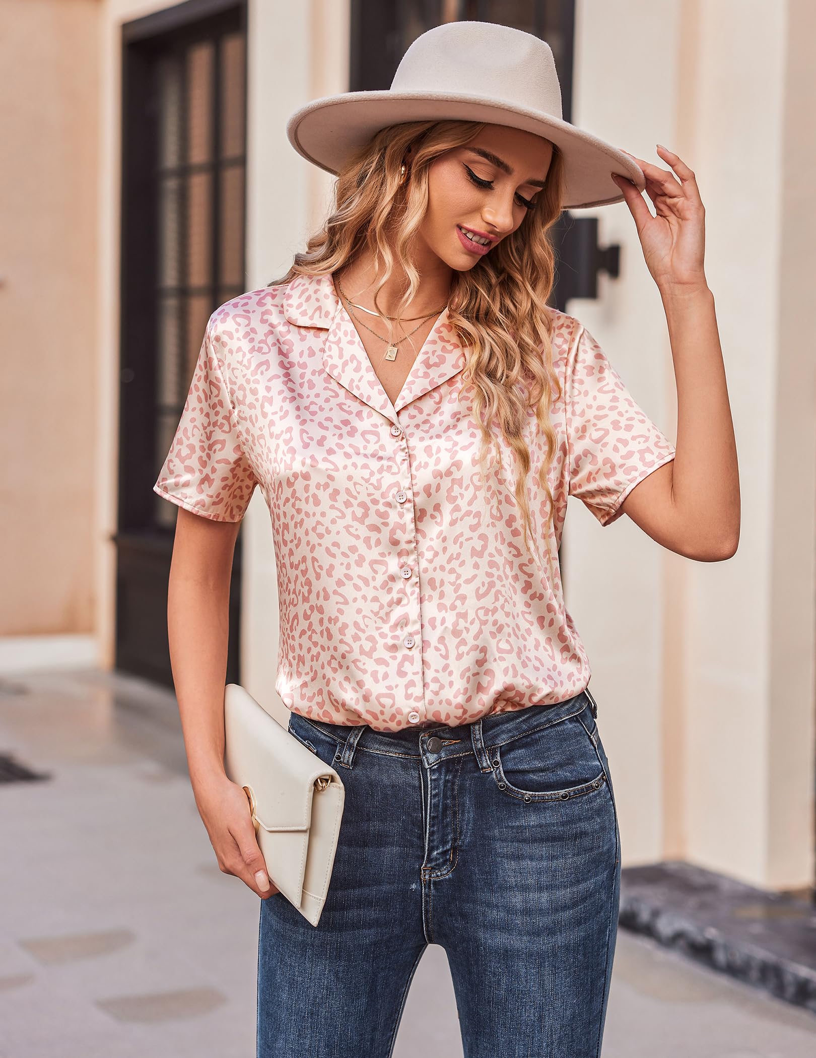 【Unique Fashion Designed】: 2 Piece Satin Pajama Set Featuring Relaxed Style, Short Sleeve, Classic Notch Collar, Full Button Design is easy to put on and take off. Cute Print Pj Set With Elastic Waist Contrast Trim Pajama Shorts will give you more comfortable and freendom feeling when you wear it.