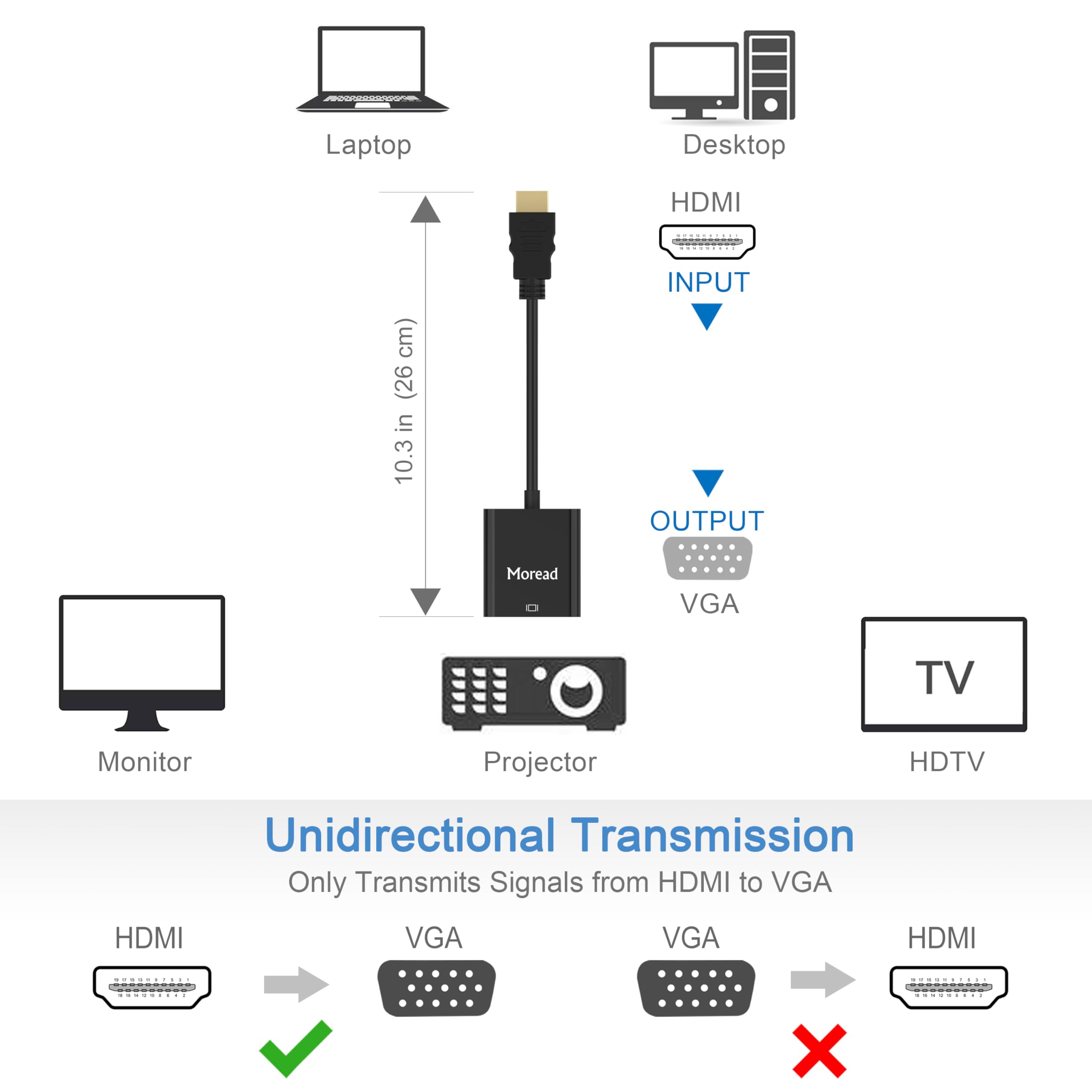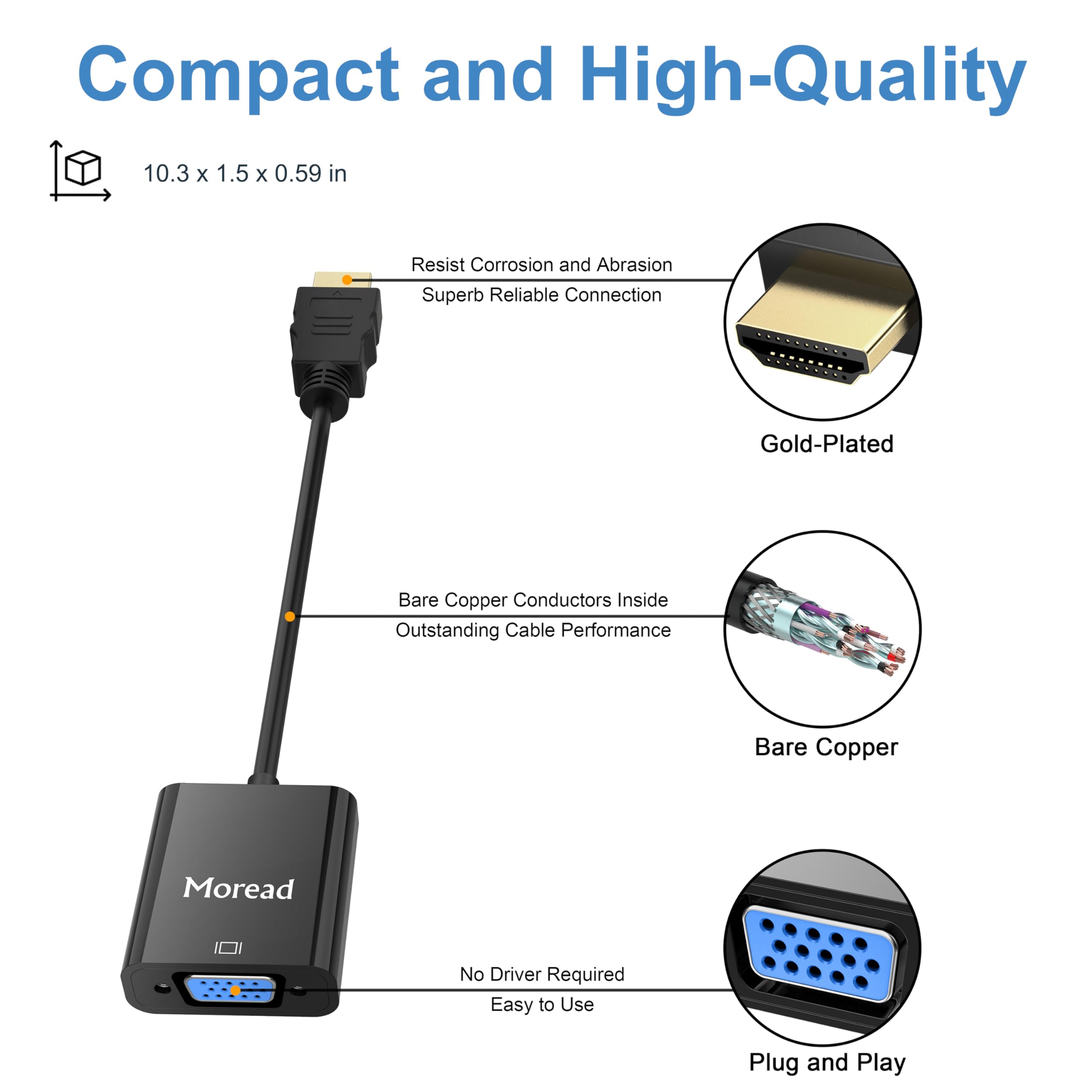 COMPACT DESIGN: The compact-designed portable Moread HDMI to VGA adapter connects a computer, desktop, laptop, or other devices with HDMI port to a monitor, projector, HDTV, or other devices with VGA port; Tuck this lightweight gadget into your bag or pocket to do a business presentation with your laptop and projector, or extend your desktop screen to a monitor or TV; A VGA cable is required (sold separately)