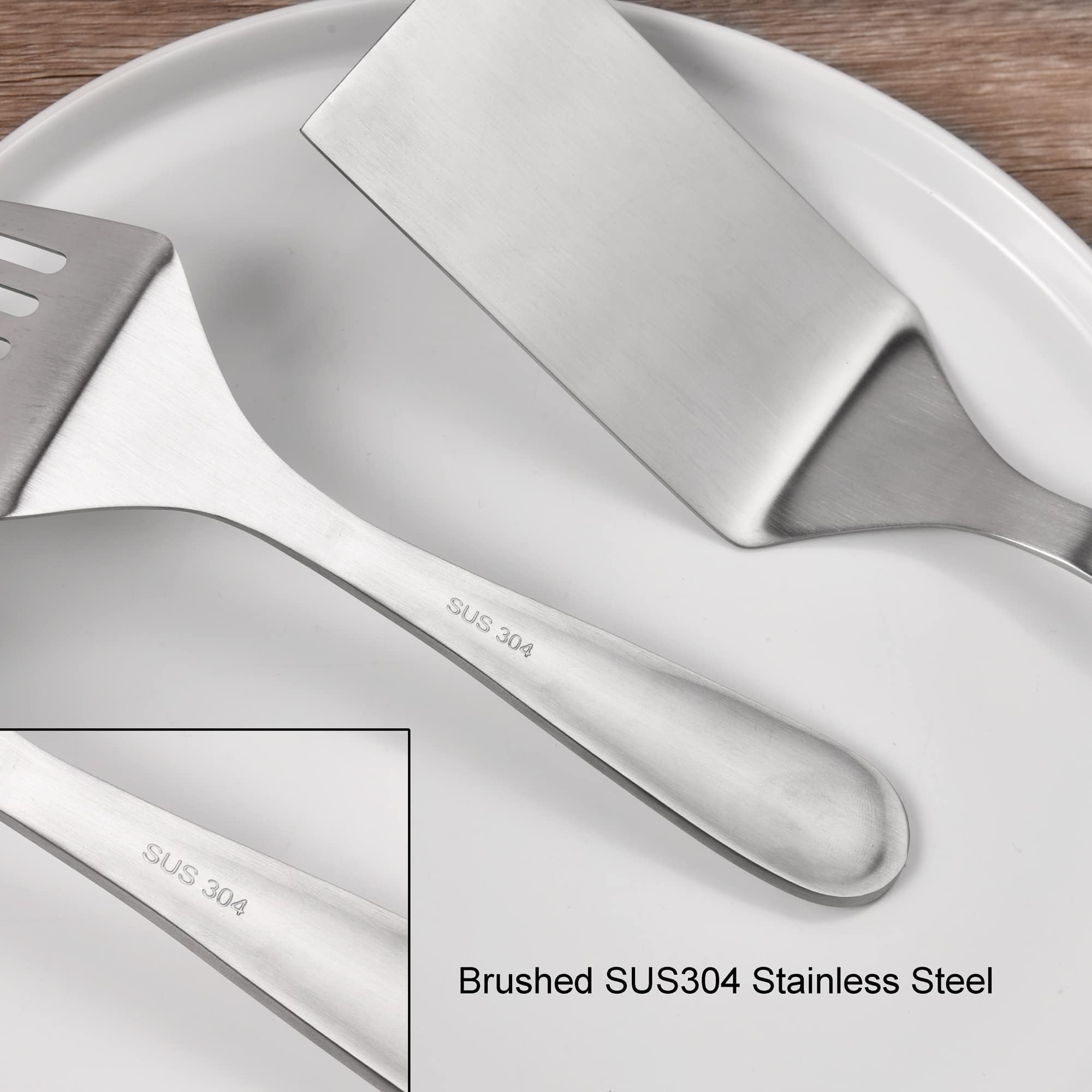 Material: Our spatulas are made of premium food grade SUS304 stainless steel ensure its anti-corrosion and rust-free. Won't bend when pressing down on blade. Brushed finish surface is easy to clean and dishwasher safe.