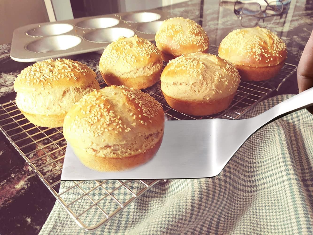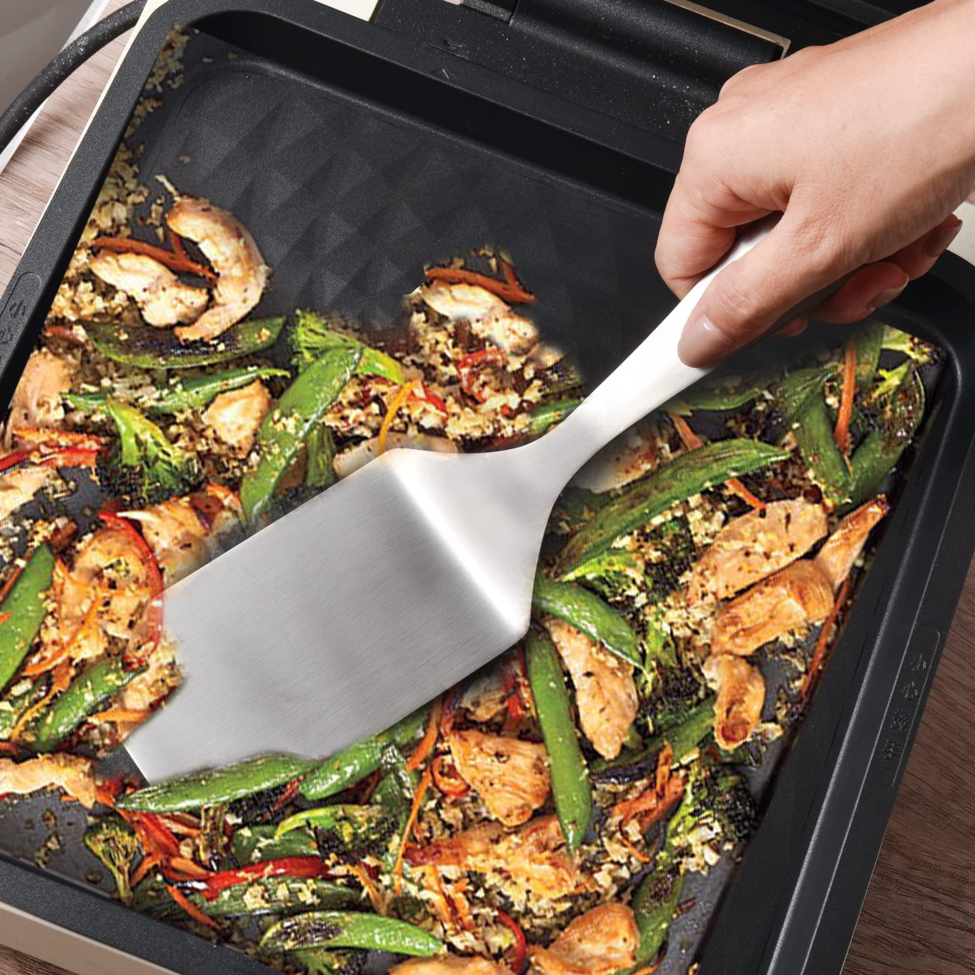 Size: Total length of 10inch and blade width of 4.1inch are large enough for holding more veggies, seafood or meats at once, flat edge is easy to slide under food and flip over your food.