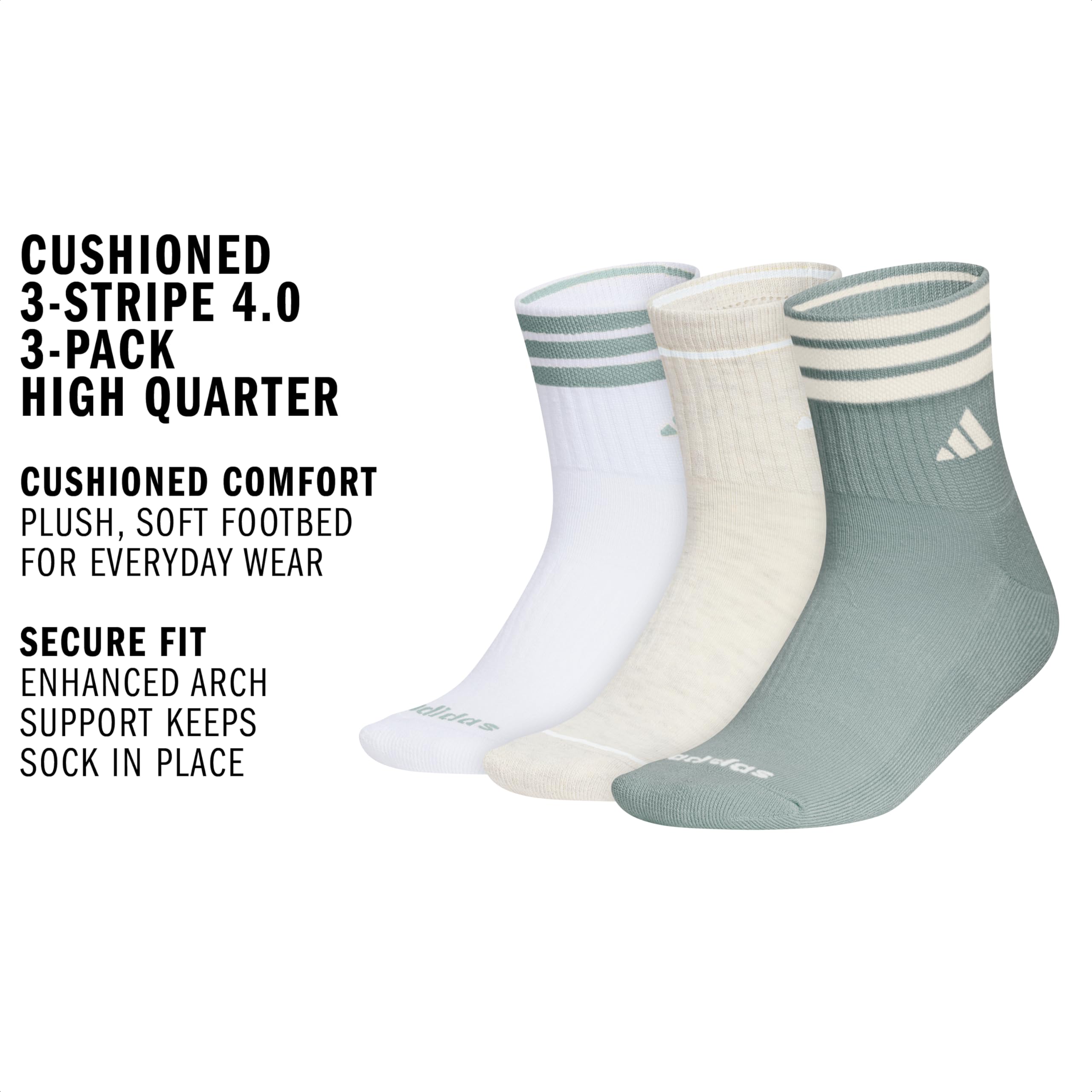 Description These women's cushioned quarter-high socks go long on comfort. Thoughtful details like extra arch support and moisture-wicking yarns help you power through your personal records. Simple adidas logos root your style in sport. Includes three pairs, so you have options.