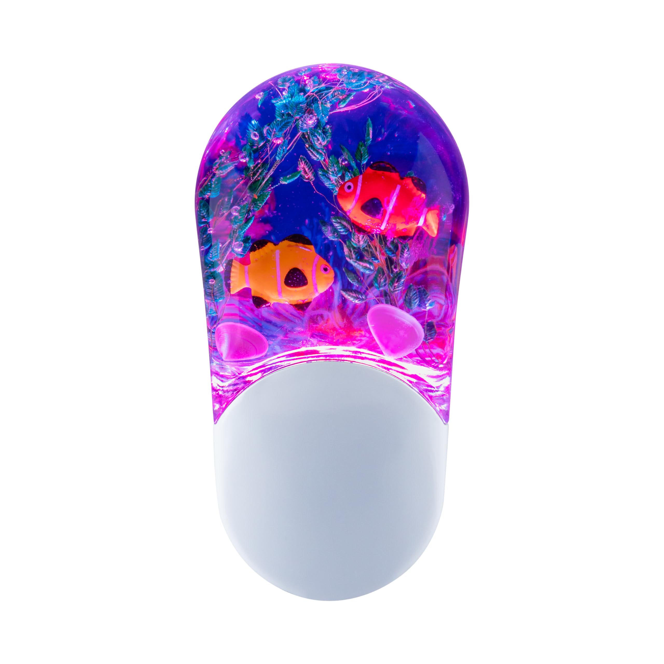Add a little color to your night with the Aqualites Color-Changing LED Night Light. This colorful night light creates a soft glow behind a vibrant tropical fish image. The LED slowly changes color between red, blue, green and multi-color. With the light-sensing feature and long-life LEDs, this night light is energy efficient, since it turns on and off automatically with the change in room lighting. Its unique, space-saving design allows use of the second outlet without interference..