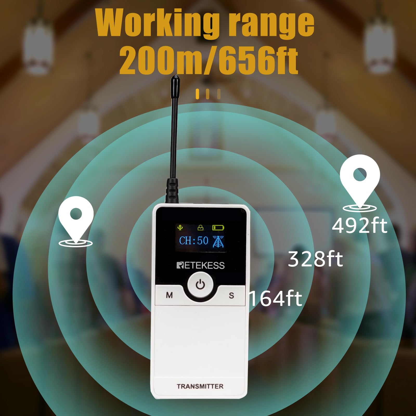 Retekess TT126 2 way communication system range of 280m/919ft; allowing participants to move freely within this range without losing connection; In factory environments; participants explore different areas of the factory; without missing any information or instructions