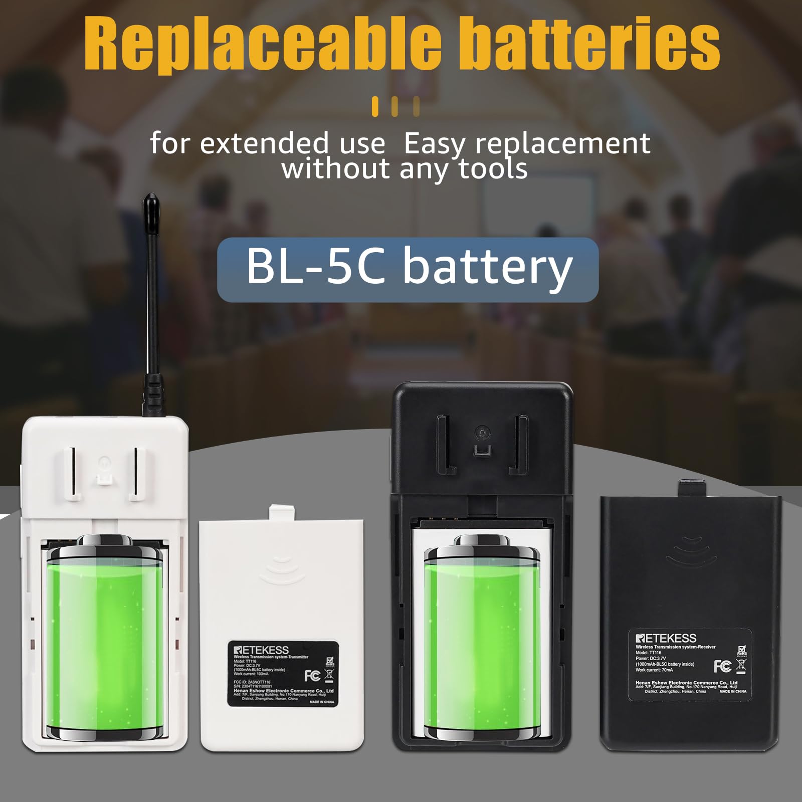Retekess TT126 tour guide system with two way audio has a 10 h operating time for the transmitter and 10-70 h for the receiver when fully charged; ensure that participants can complete an entire factory tour without any interruptions due to a depleted battery