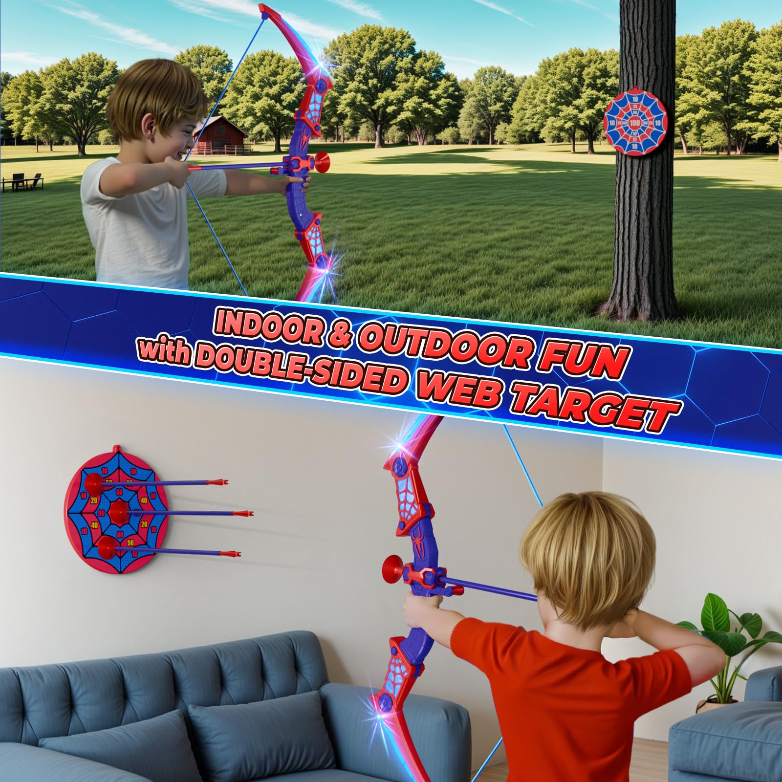 Thrilling Spider LED Light-Up Action: This kids bow and arrow set features red and blue LED lights that shine through the vibrant red spider web design, adding an extra thrill to every shot, especially during night play. The LED lights give an exciting superhero twist, making playtime more engaging and visually captivating. Kids will feel the rush of superhero powers as the lights illuminate their every move. Great for toys for 3 4 5 6 7 8 9 10 11 12 year old boys.