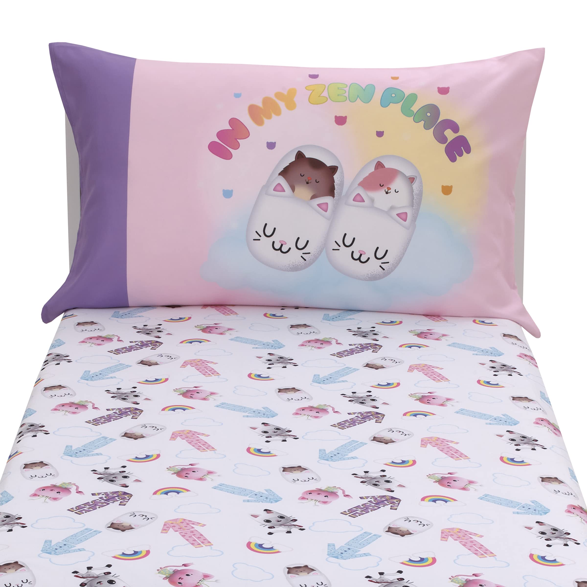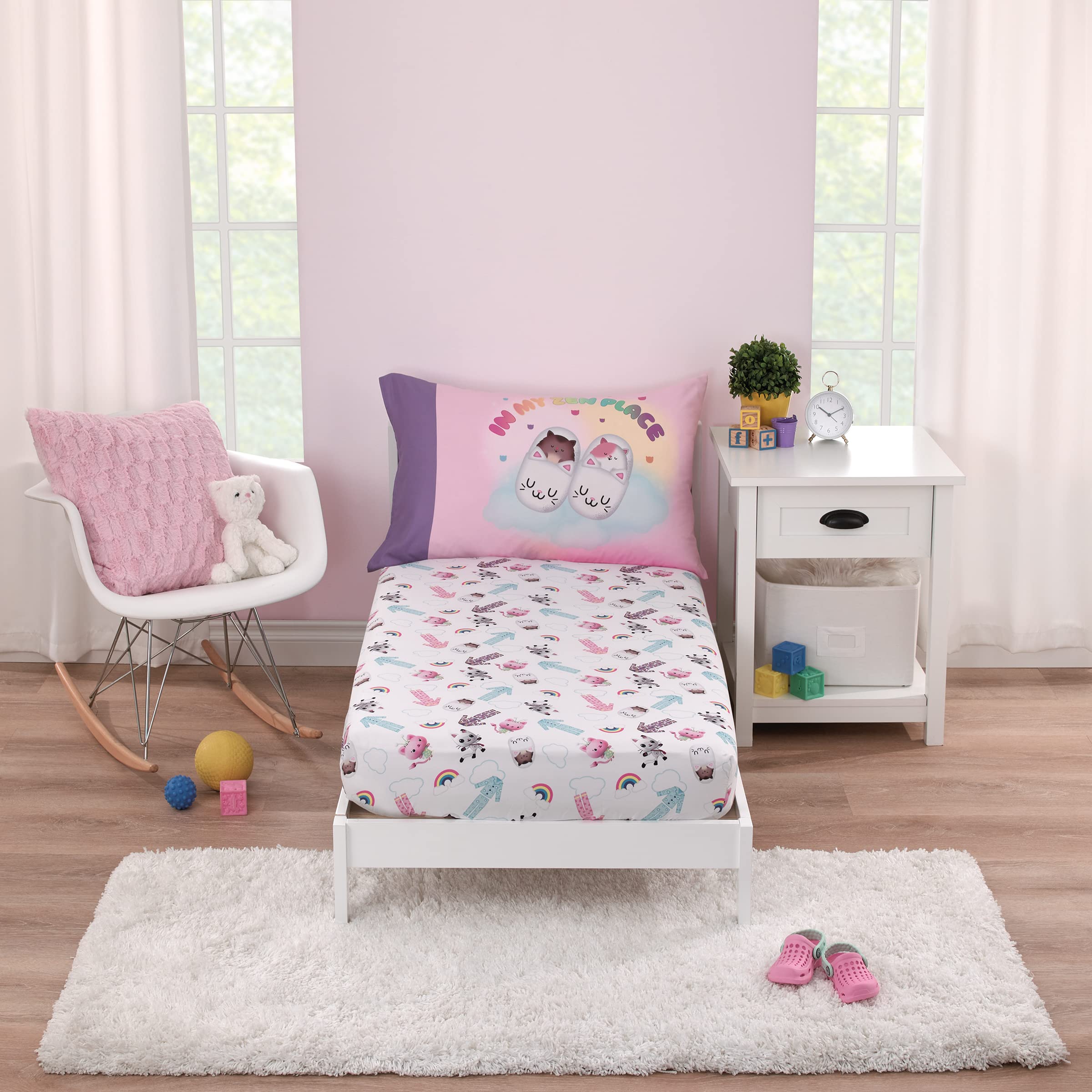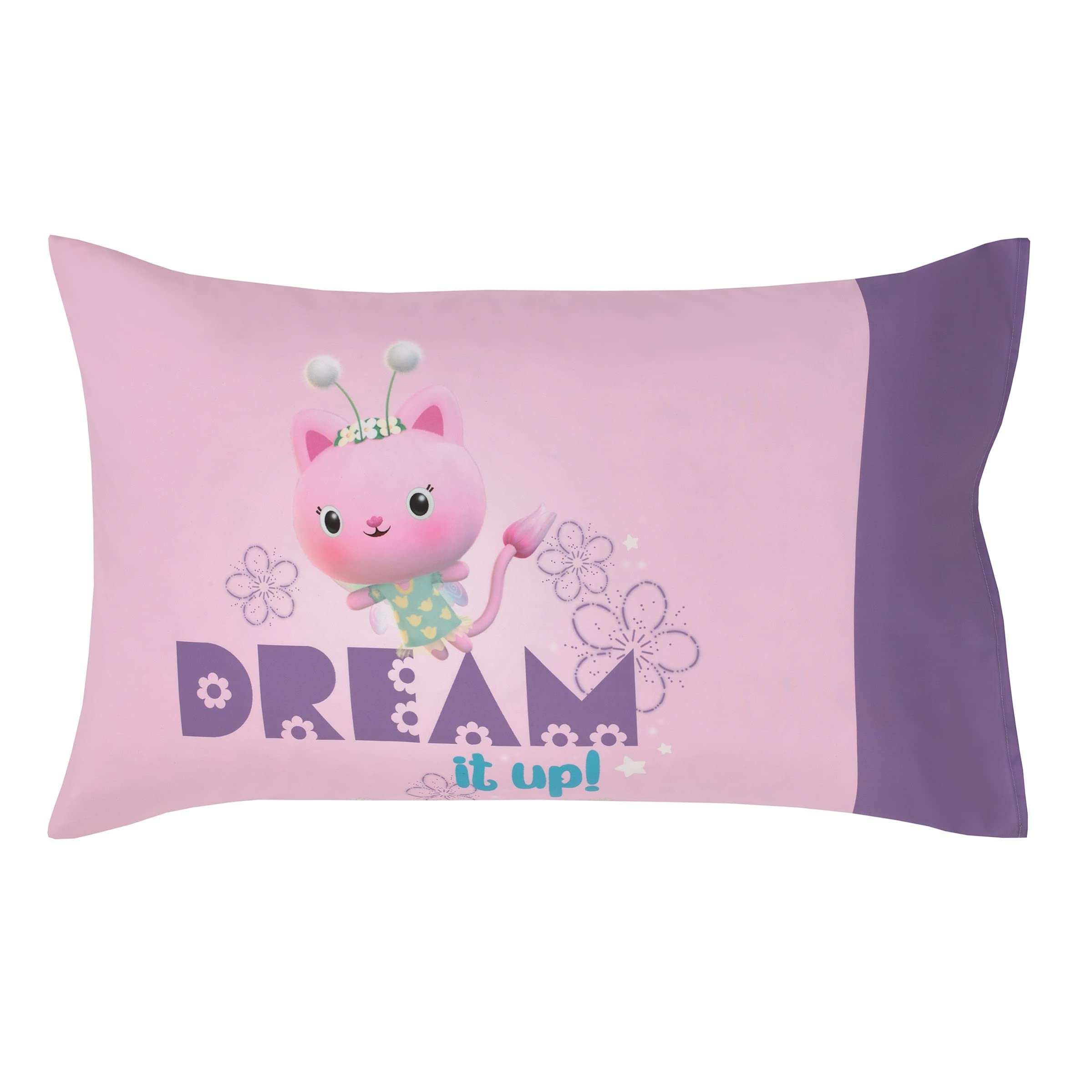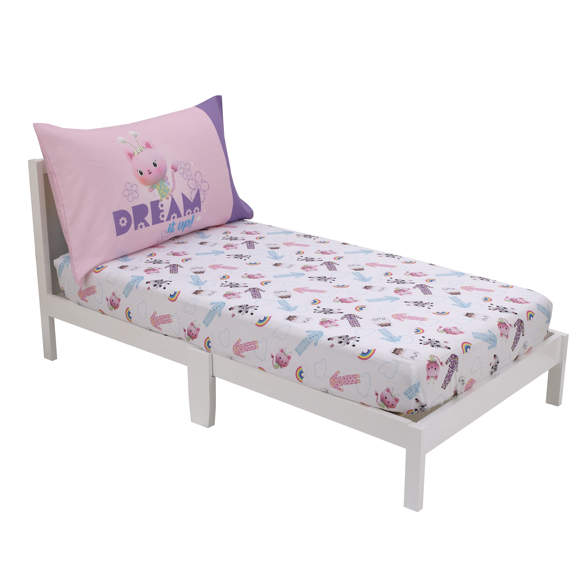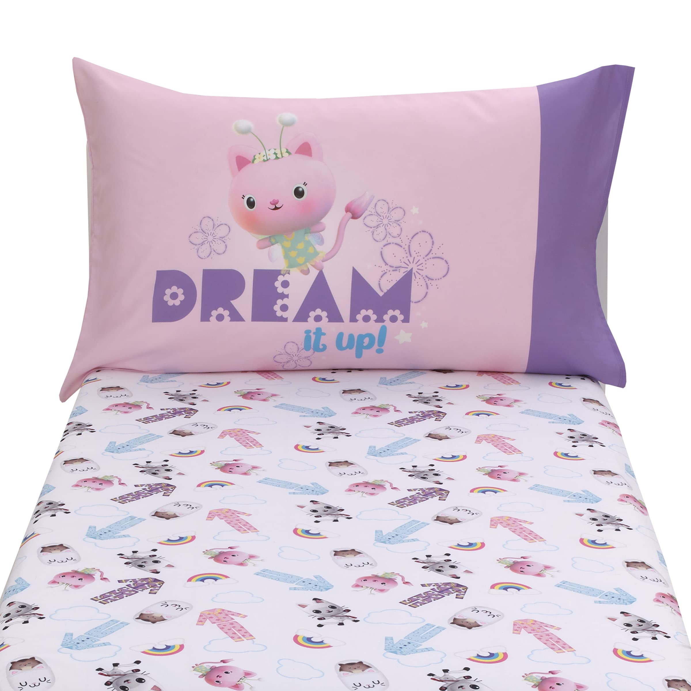The Gabby's Dollhouse Dream It Up 2 Piece Toddler Sheet Set includes a fitted bottom sheet and reversible pillowcase. Features PJ Time with Gabby and Kitty Fairy, colorful rainbows and clouds with a fun pajama tree! Designed in shades of pink, purple, aqua, yellow, and white. Made of super soft fabrics for a snuggly sleeping surface. The 20" x 30" pillowcase is reversible, and the fitted sheet measures 28" x 52" x 8". Fits a standard size mattress. Includes full elastic edges for a safe and snug fit. Perfect for your toddler's room. Coordinates with the DreamWorks Gabby's Dollhouse Dream It Up toddler bedding and accessories.