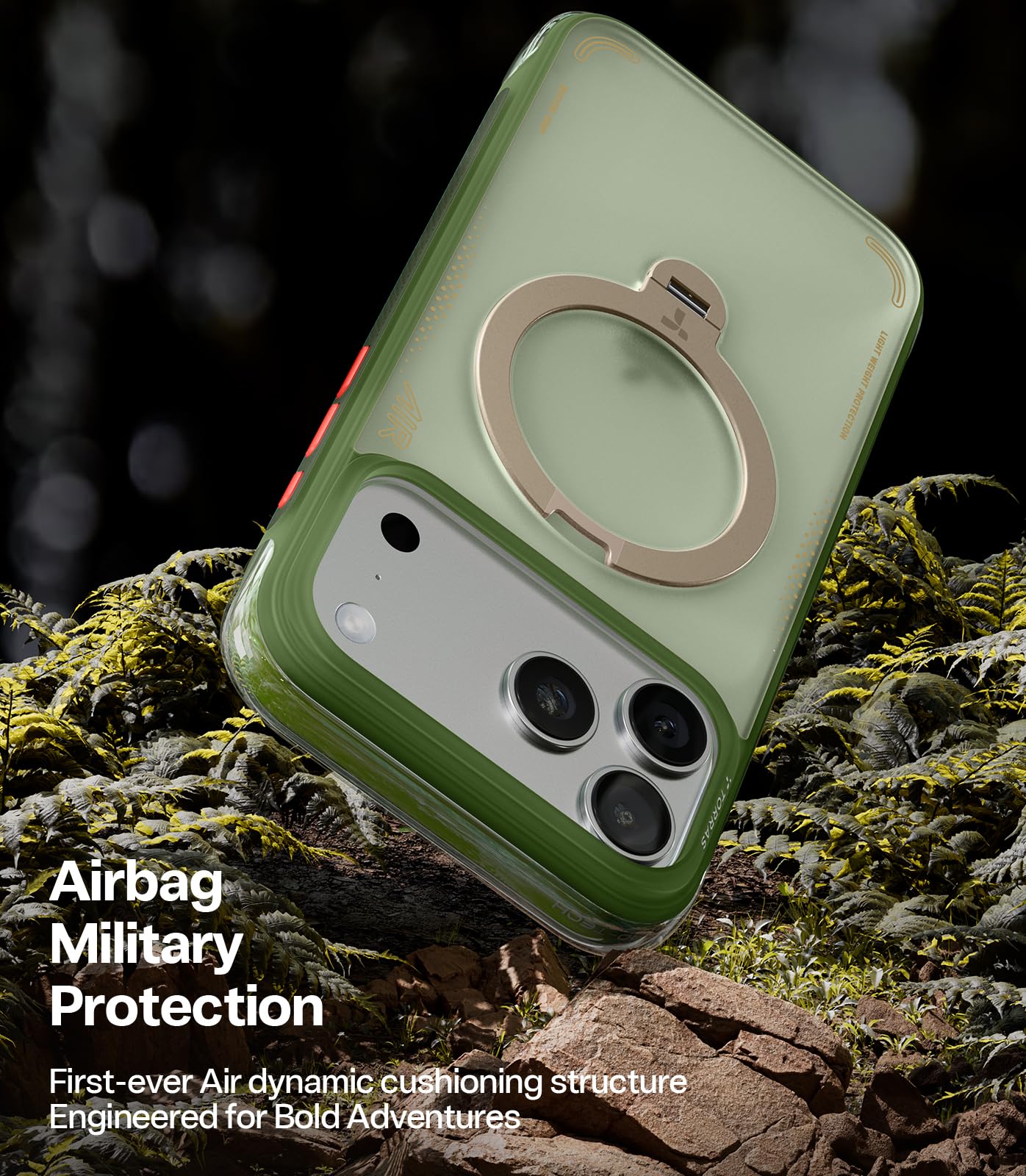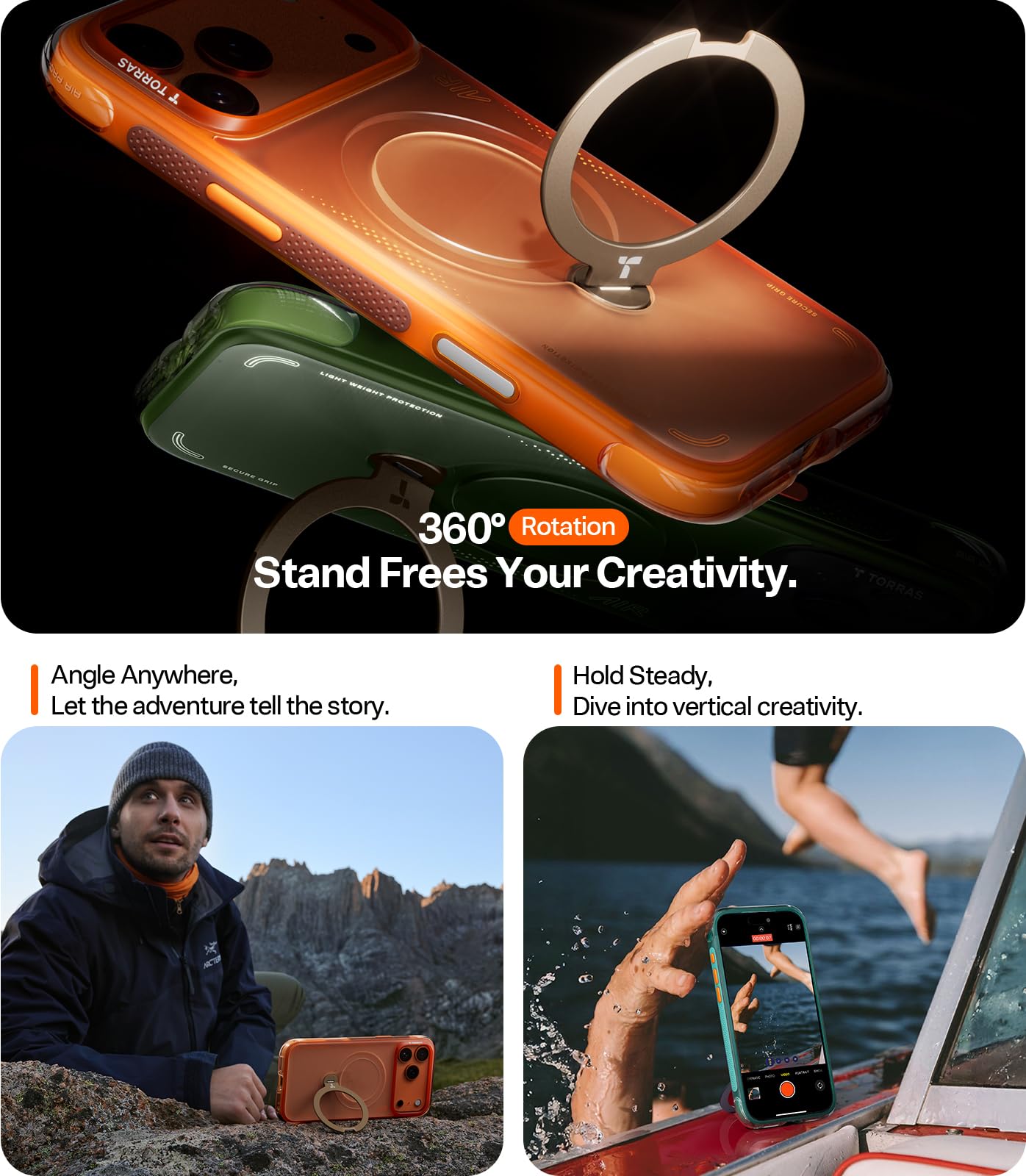 [360° Ring Stand – Unlock Infinite Creative Anywhere] The case for iPhone 17 Pro case with an exclusive 8-layer stand structure locks in place in one second. Rotate vertically, horizontally, or at any angle. Whether it's fitness, daily records or content creation, the Q3 Air for iPhone 17 Pro case with stand can keep your phone standing steadily and hands-free. Tested to withstand more than 3,000 folds without loosening. Sturdy and durable -Always ready for the burst of inspiration and improve your life efficiency