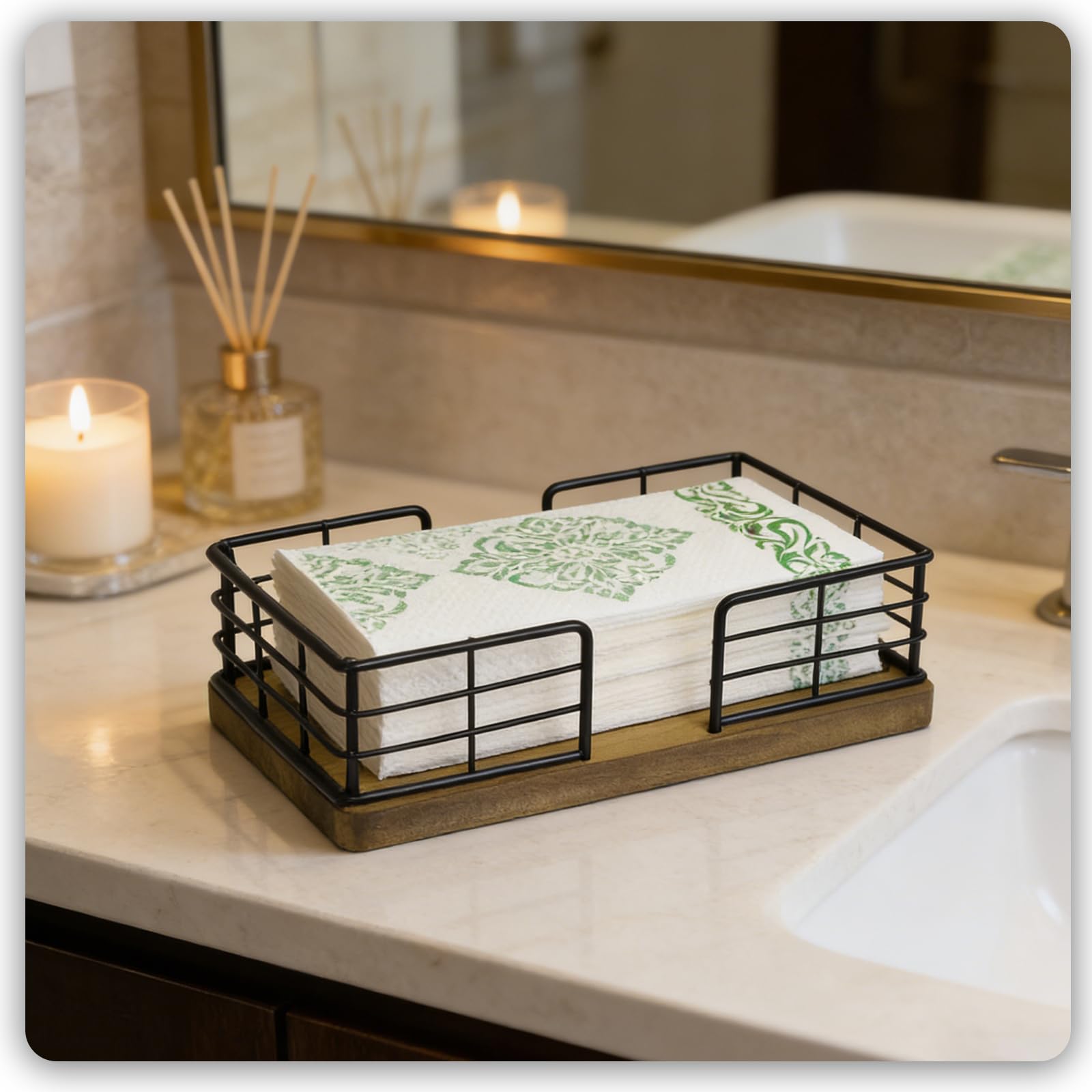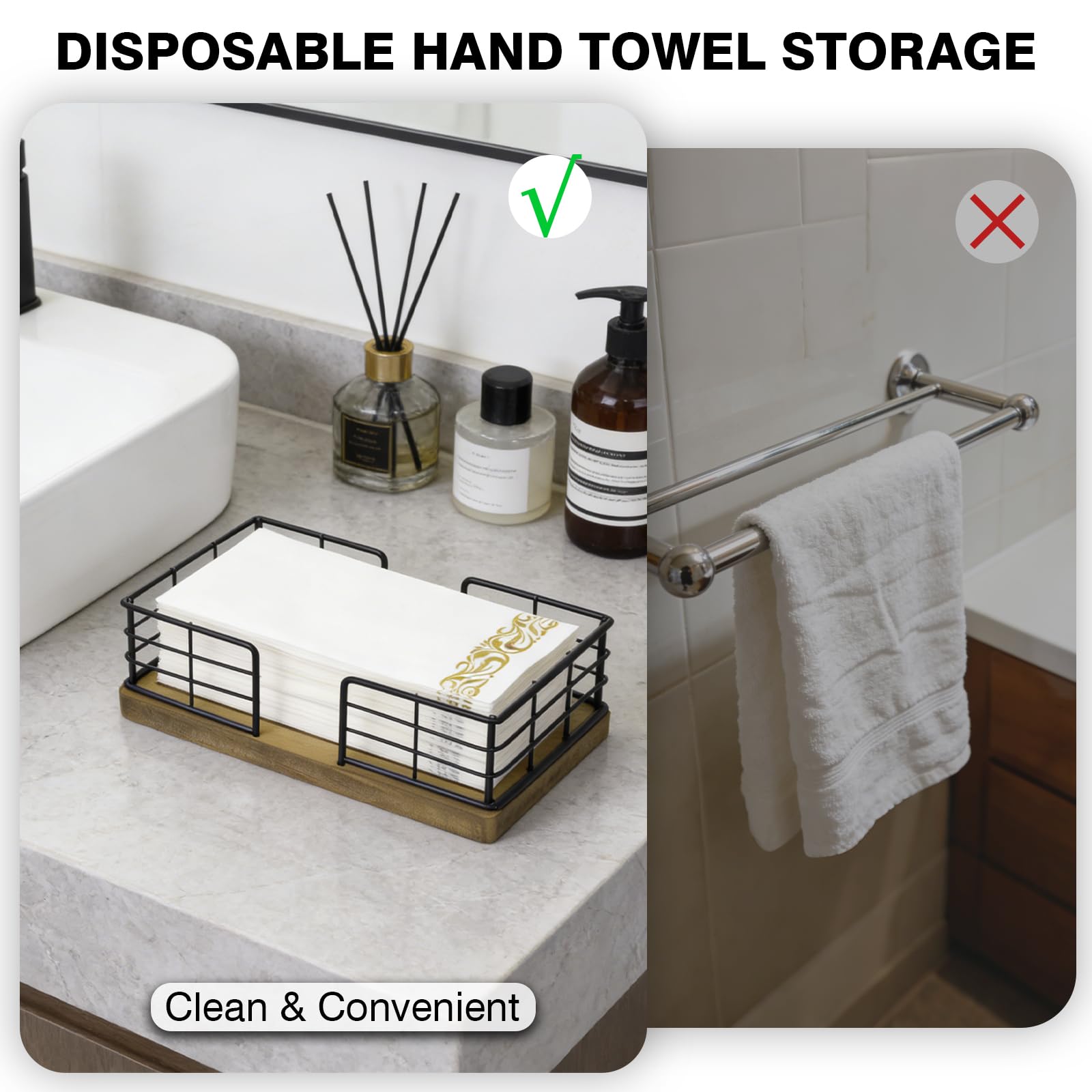🍃【GUEST TOWEL HOLDER TRAY FOR BATHROOM】The Guest Towel Holder features the latest appearance design, the unique opening design is convenient for extracting guest paper towel. Perfect size can well hold 3.9*8.2in (10*21cm) napkins.