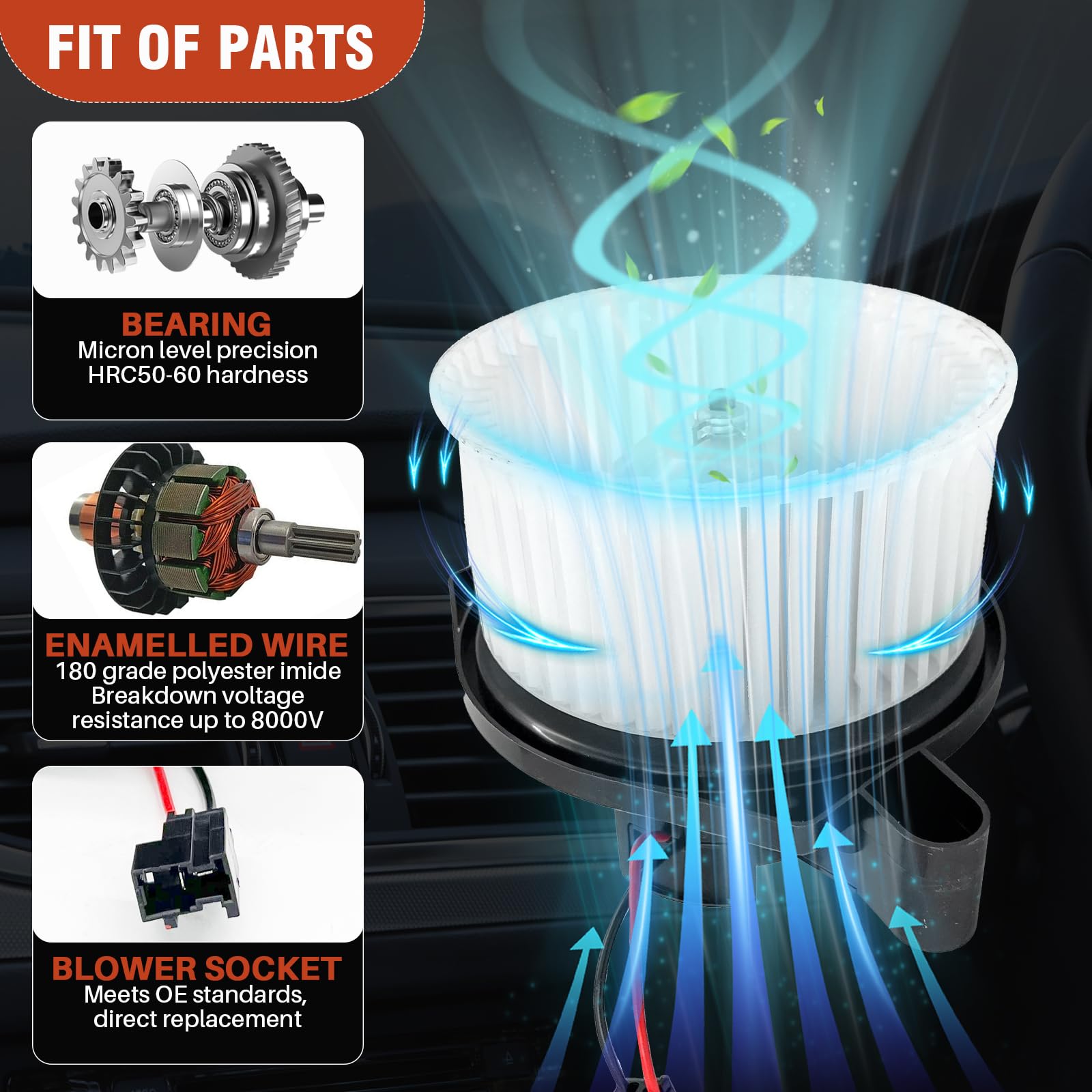 【OEM Standard & Durability】Manufactured in strict compliance with OEM specifications, this AC blower motor is constructed from premium wear-resistant materials. It ensures consistent airflow output paired with quiet, smooth operation. A 3-year free coverage service are included for your peace of mind