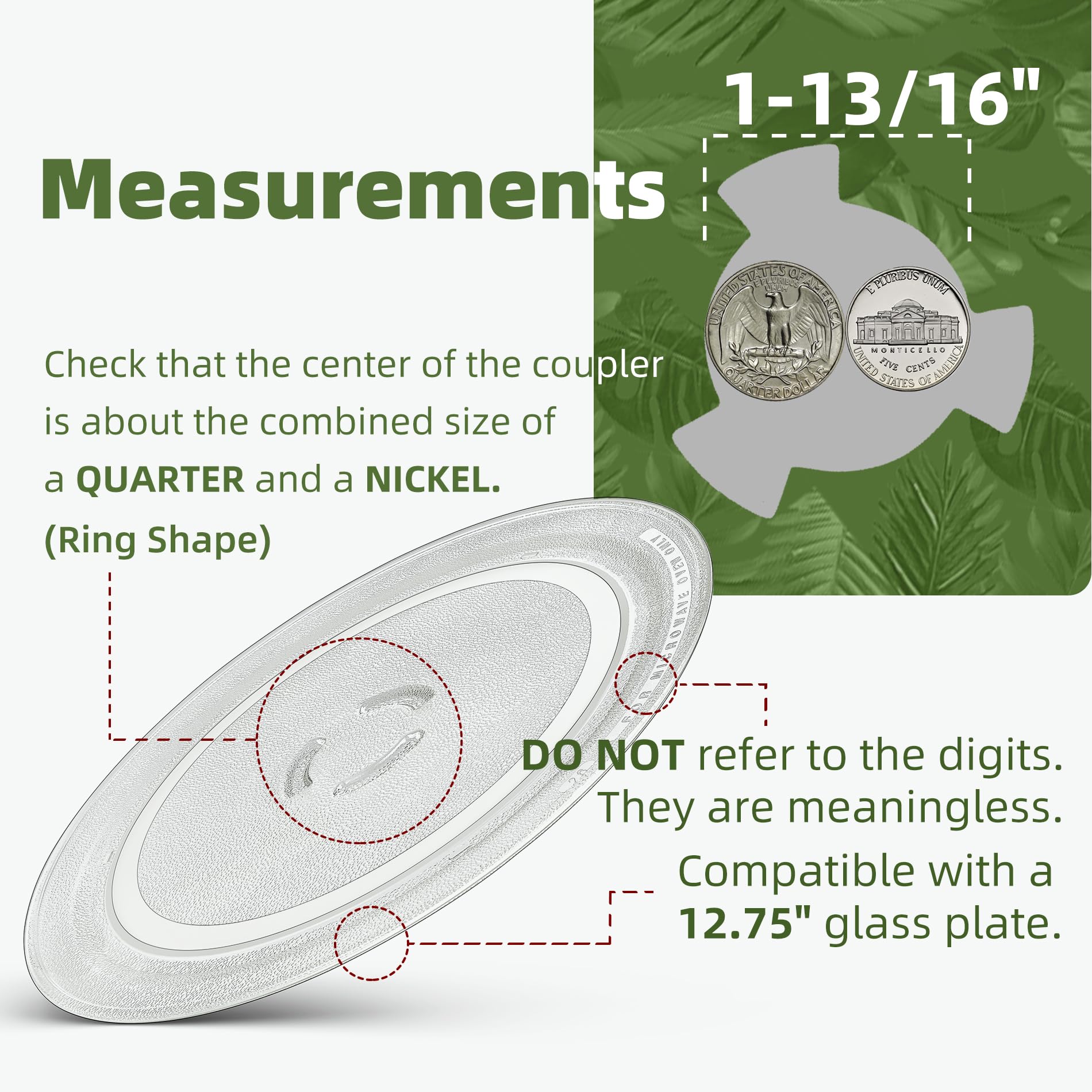 【Measurement 1】This 12.75“ microwave plate replacement has a one-quarter and one-Nickel sized ring shape hole in the center. The center spot of microwave glass turntable coupler measures 1 13/16" in diameter