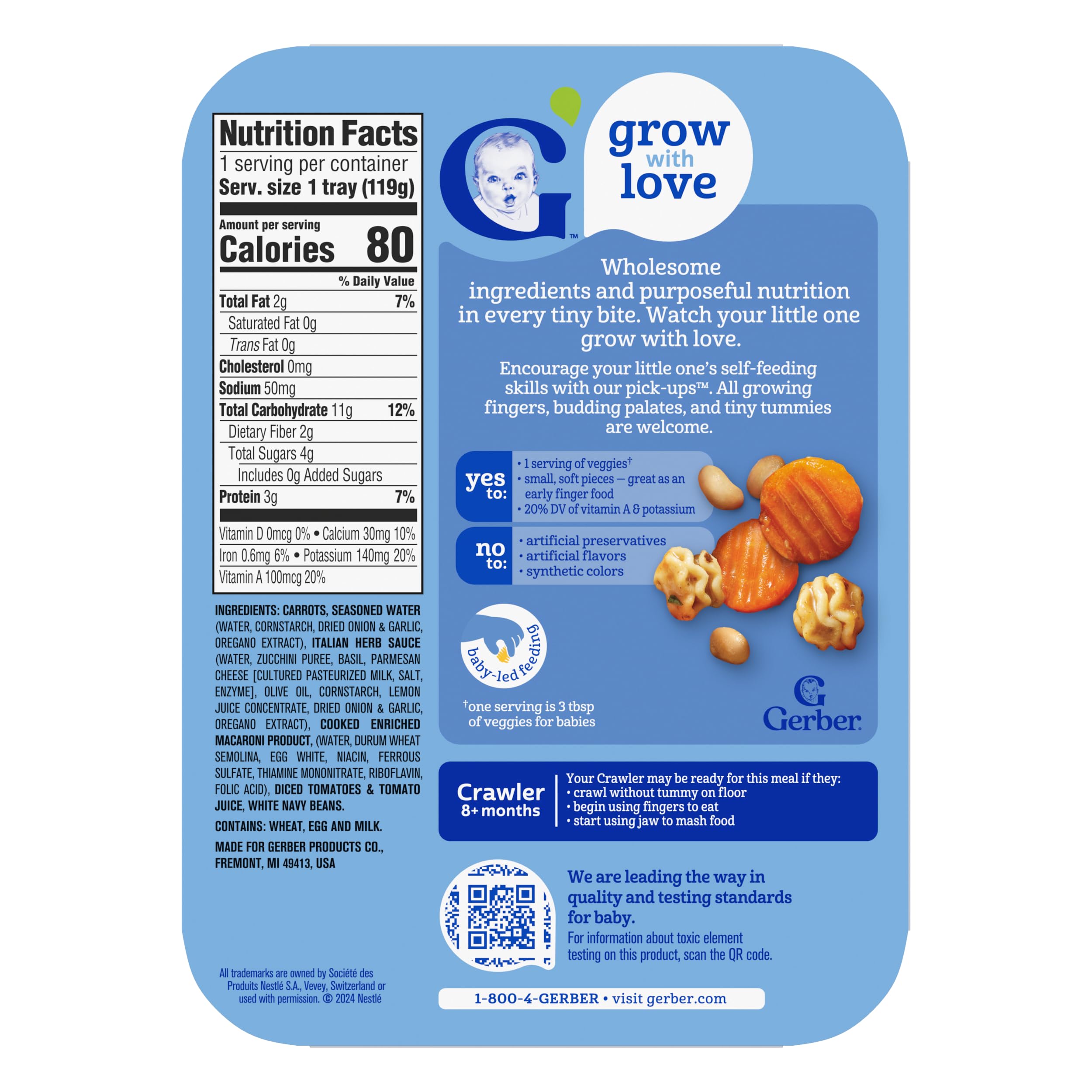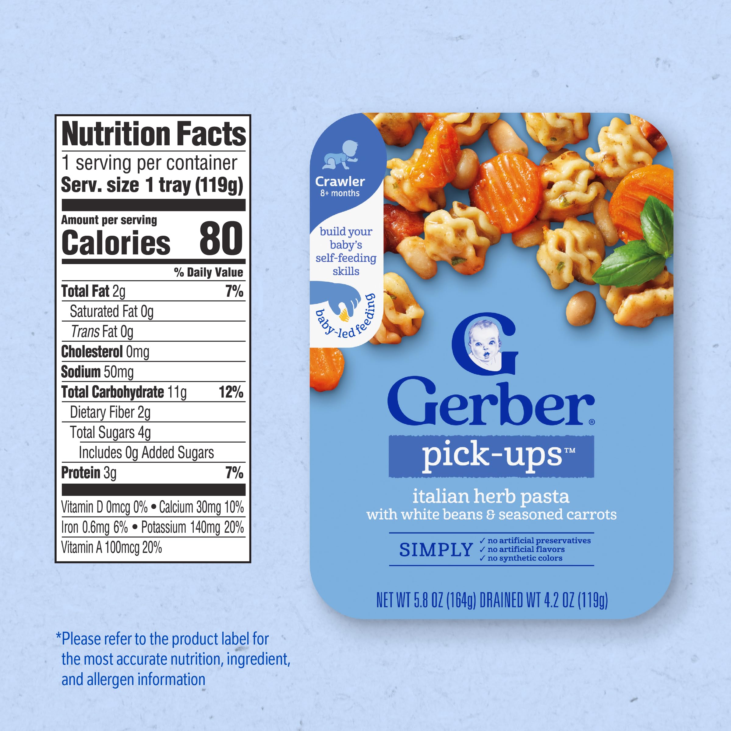 BABY MEALTIME: Gerber Pick-Ups Italian Herb baby pasta comes with white beans and seasoned carrots. Ready to eat in under 5 minutes, this baby food is perfect for busy parents who need a quick and nutritious option for their little one