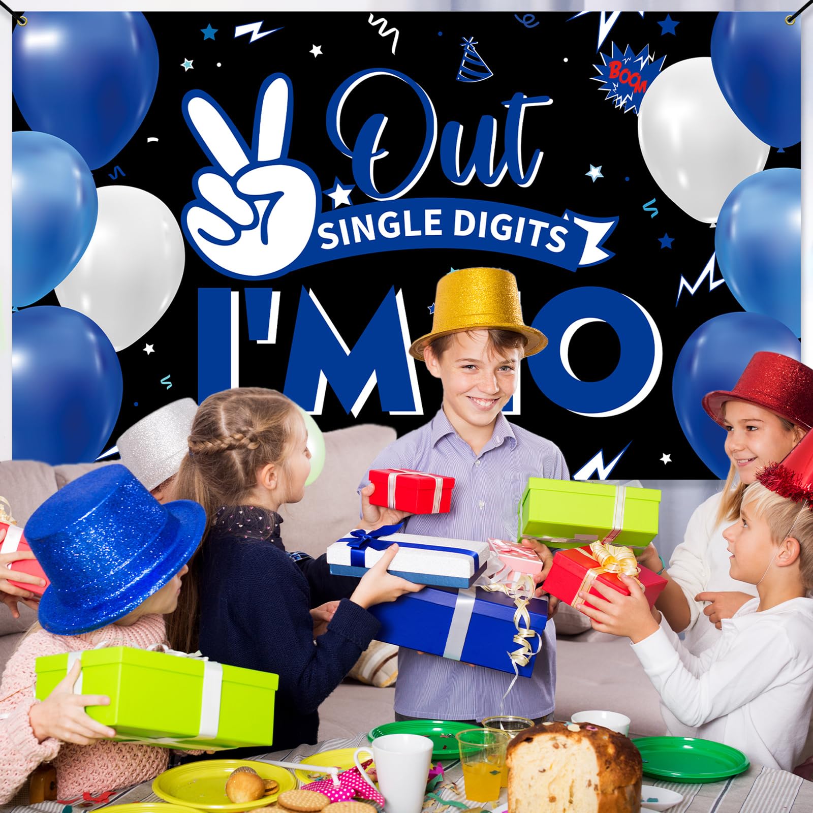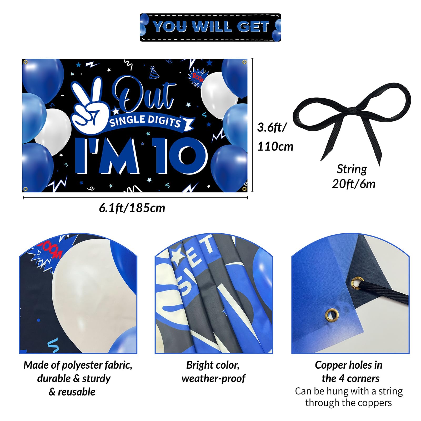 [YOU WILL GET] 1pcs “Out Single Digits, I’m 10” backdrop decorations for 10 birthday. It measures approximately 6.1 feet by 3 feet (185 cm by 90 cm, L*W) and includes a 20-foot string.