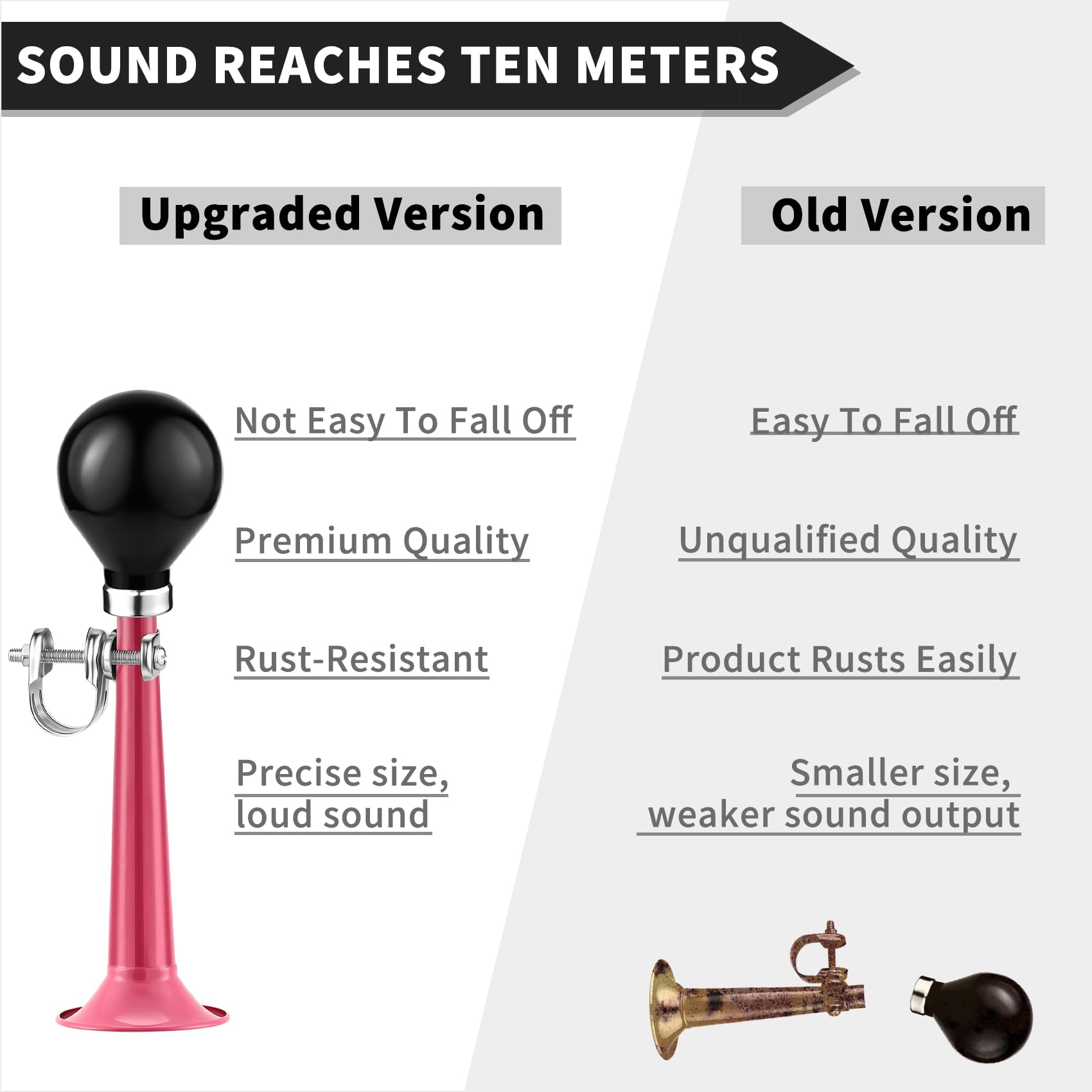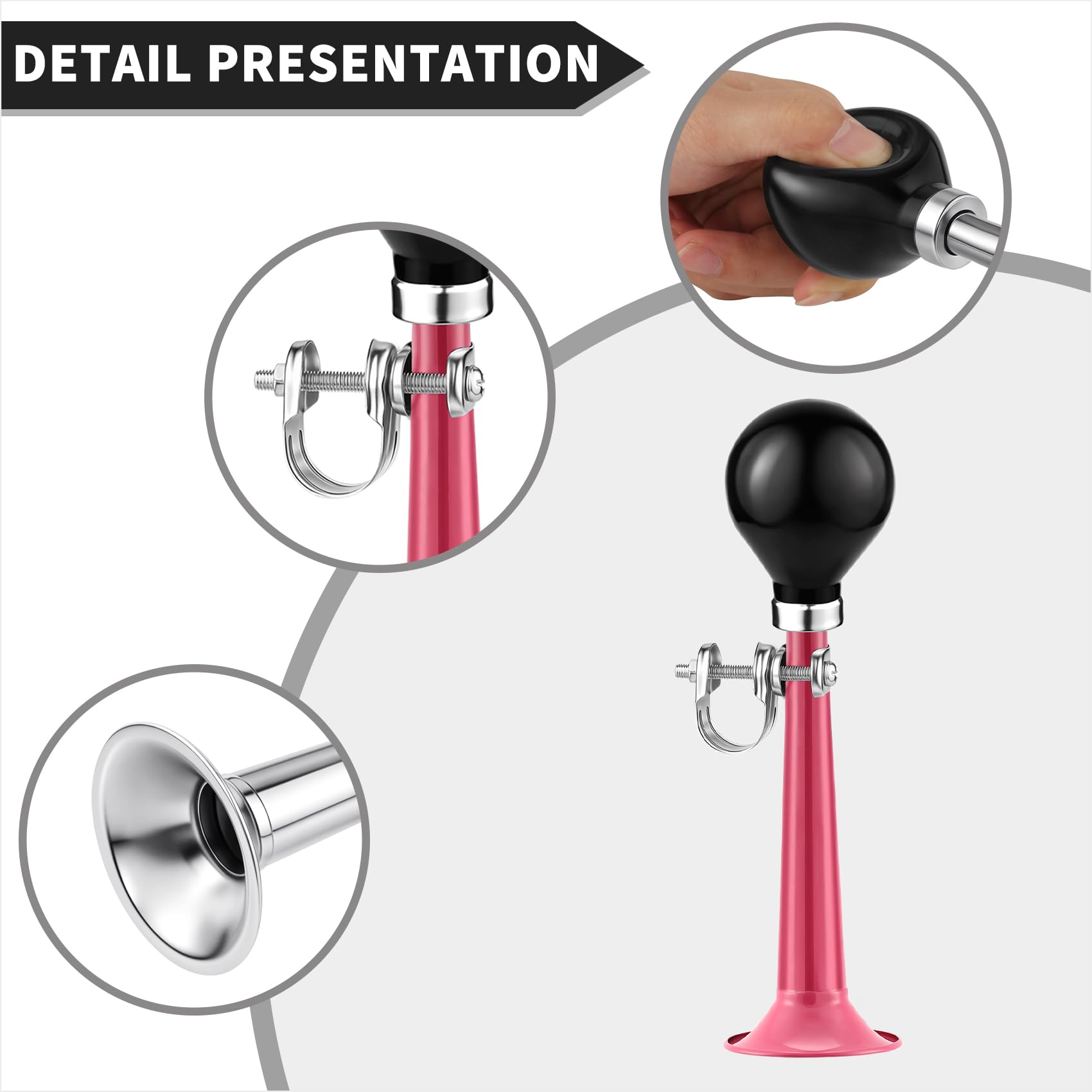 HIGH-QUALITY The front section of the horn is made of a sturdy aluminum alloy to ensure durable and non-rust. The rubber ball of the horn is made of flexible rubber to ensure non-broken.
