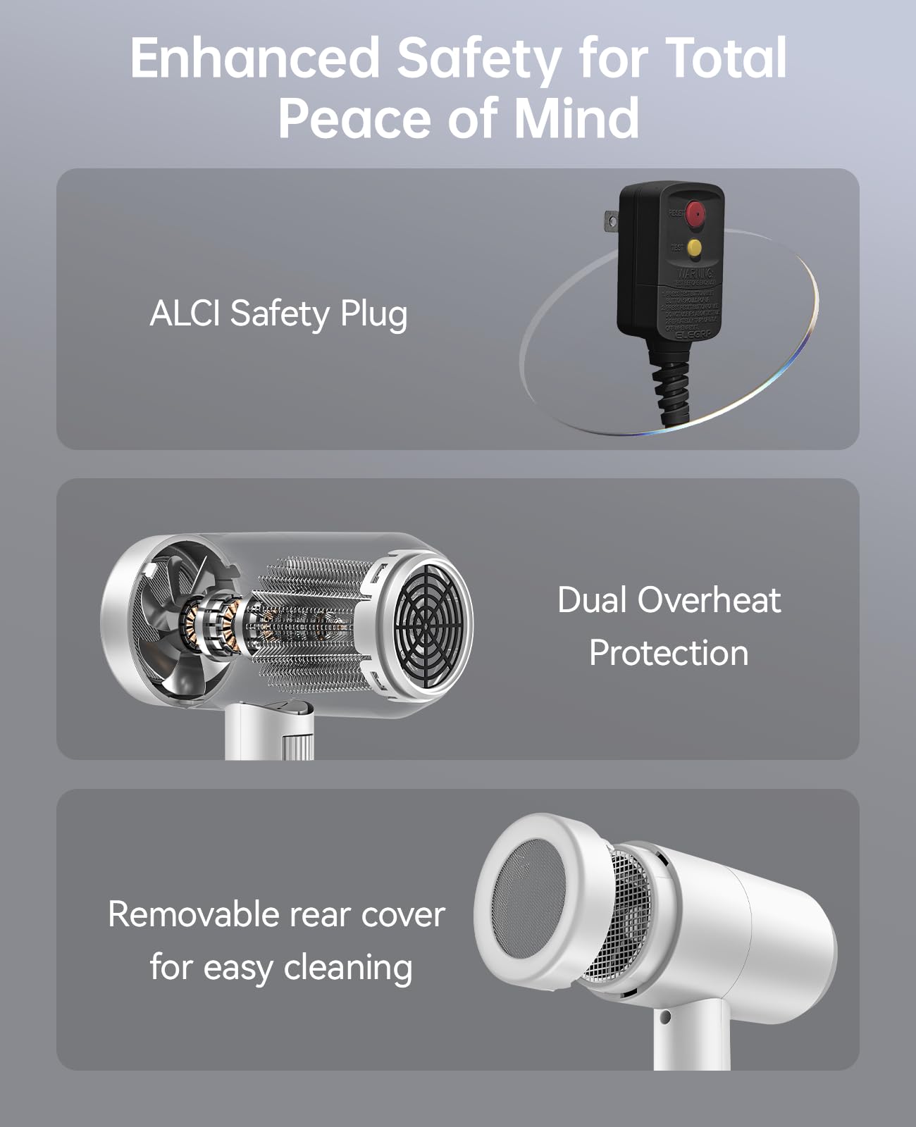 【Hair Dryer with Diffuser】 With 1 Concentrator & 1 Diffuser for All Hair Types, Concentrators nozzle is ideal for precision styling on straight, smooth hair. Diffuser designed to enhance your natural curl and texture,Designed with double safety removable back cover, your hair will not get sucked into the blow dryer easily, and it is easy to clean.Kind Tips: Please do not touch the air nozzle during use to prevent burns.