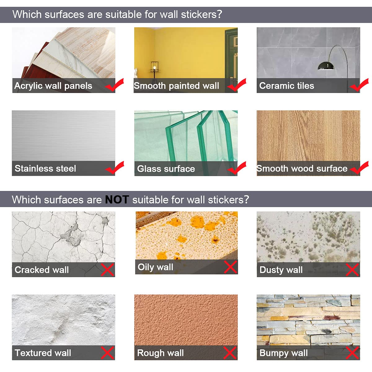 2 ,The baby room wall decals are applicable smooth and flat surfaces: the planet wall decal works on most smooth, flat, dry and dust free surfaces, Peel and Stick Removable,including doors, glass,walls, windows,cupboard and more;Not Suitable for Rough and Dusty Surfaces.
