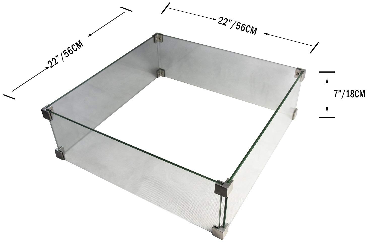 Fire Glass Specifications: Crafted from durable tempered glass, the clear fire pit wind guard has stainless steel attachment clips and is 22" x 22" x 7", 14.6 lbs. Easily install the fire pit screen on your outdoor firepit.