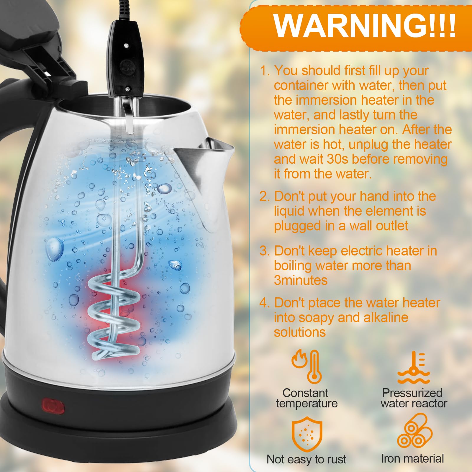 ๐ช๐๐ฅ๐ก๐๐ก๐ : 1. The heater metal ring completely immersed. 2. Donโt put your hand into the liquid when the portable water heat element is plugged in a wall outlet. 3. Cut off power before taking out heating element. 4. Do not plug two immerison heater in the same socket to avoid overload. Please find USER MANUAL under Technical Specification section on the listing and READ it carefully before use