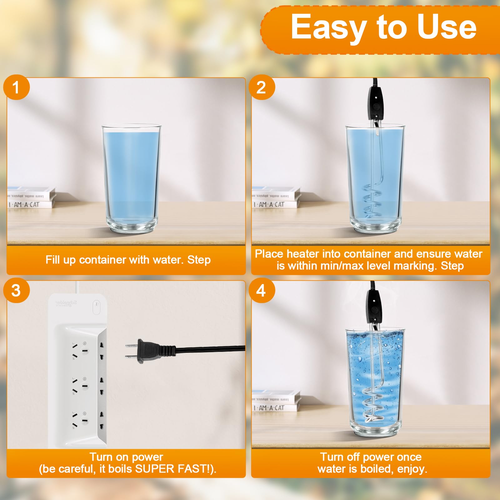 ๐ฆ๐ถ๐บ๐ฝ๐น๐ฒ ๐๐ผ ๐จ๐๐ฒ : First fill your container with water, then put the travel water heater into the water and ensure water is within min/max level marking, lastly turn the electric water heater on. Please keep watching the boiling process and do not use your hands to touch. Unplug the electric heat stick when the water is hot enough or boiling, and wait a few seconds before removing it from the water