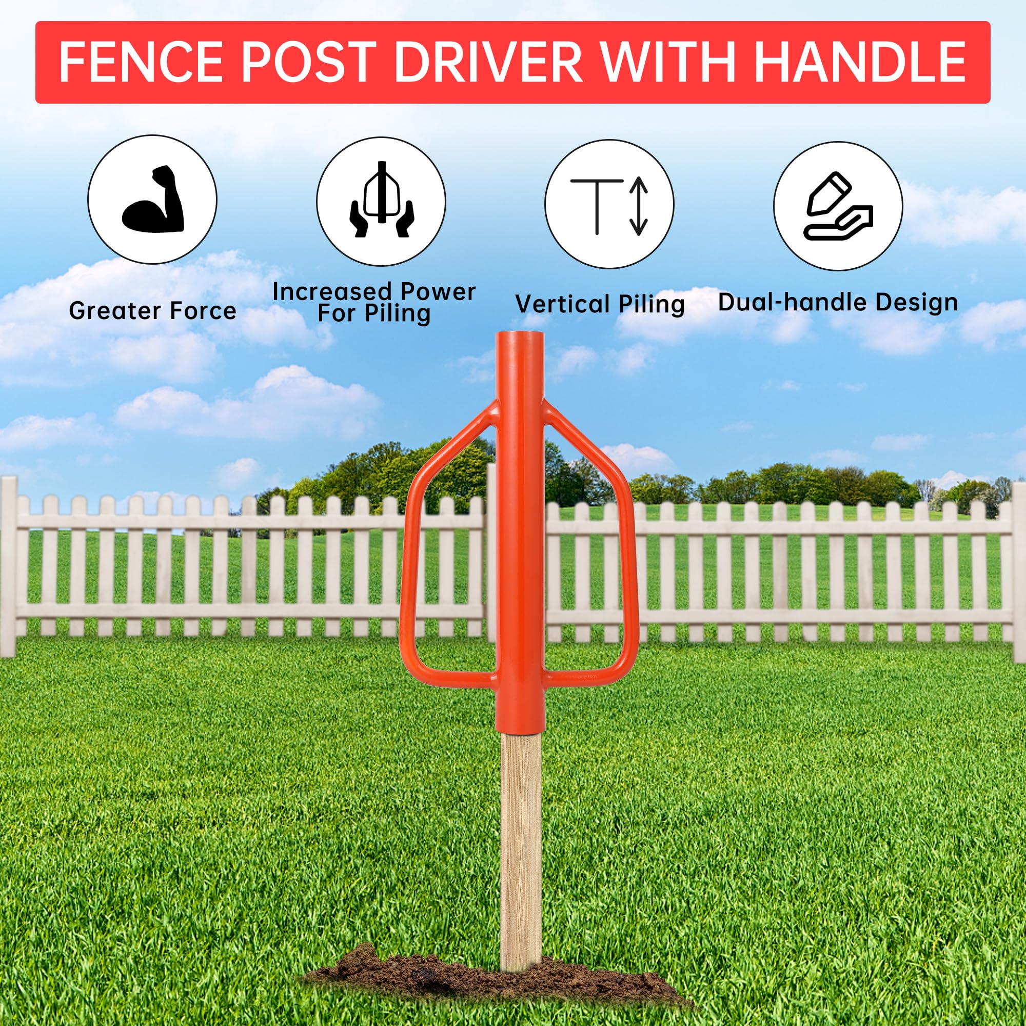 Specification Name: metal post driver with handles Five Type Options: ① 30LB ② 37LB ③ 18LB ④ 12LB ⑤ 8LB; Features: Fence Post Driver is a solid and easy-to-use tool for installing fence posts. It’s well-built and heavy-duty, making even the toughest jobs easier. The handle provides excellent grip and control, allowing for quick and efficient work. I’ve used it on both wooden and metal posts with great results. It’s a must-have for anyone putting up fencing!