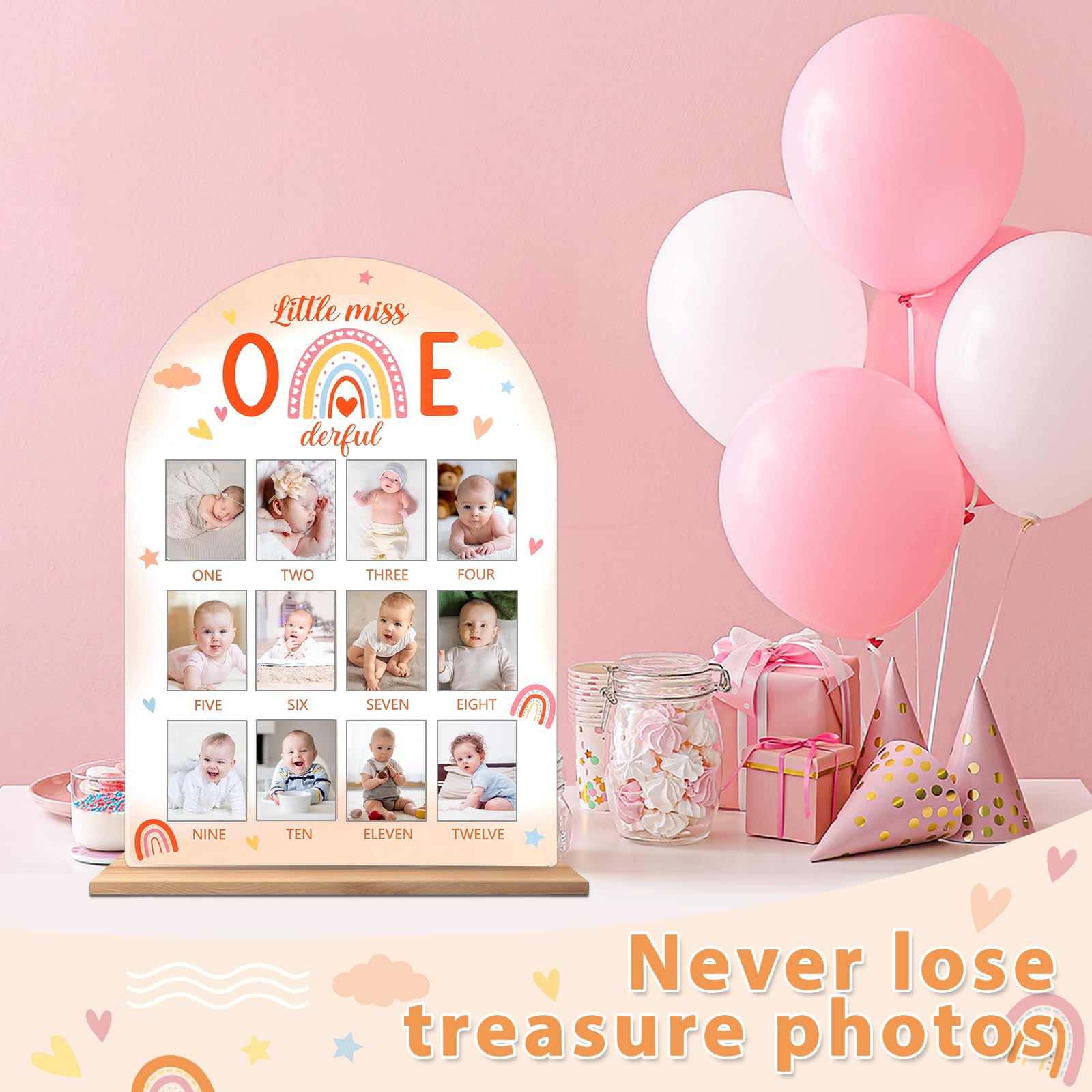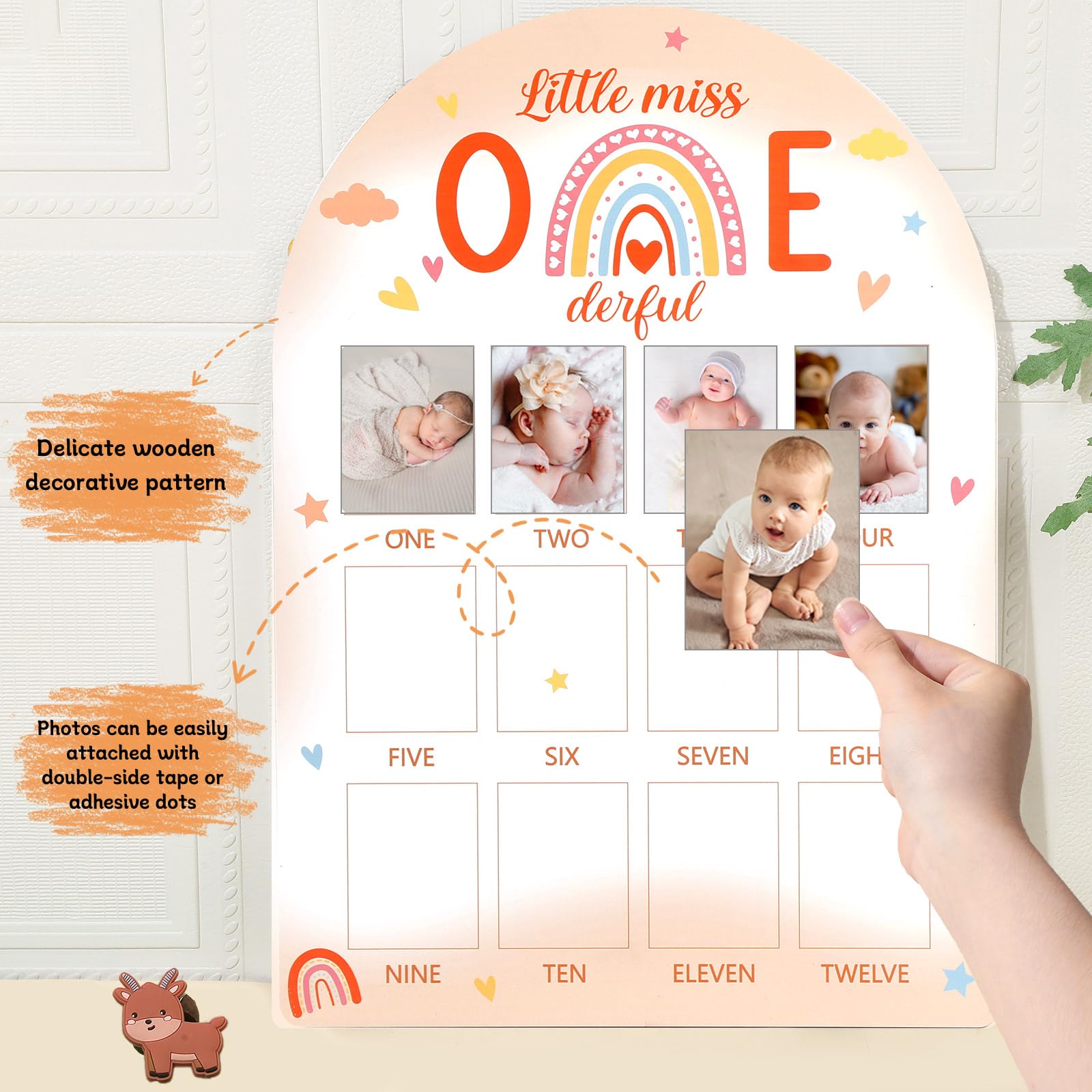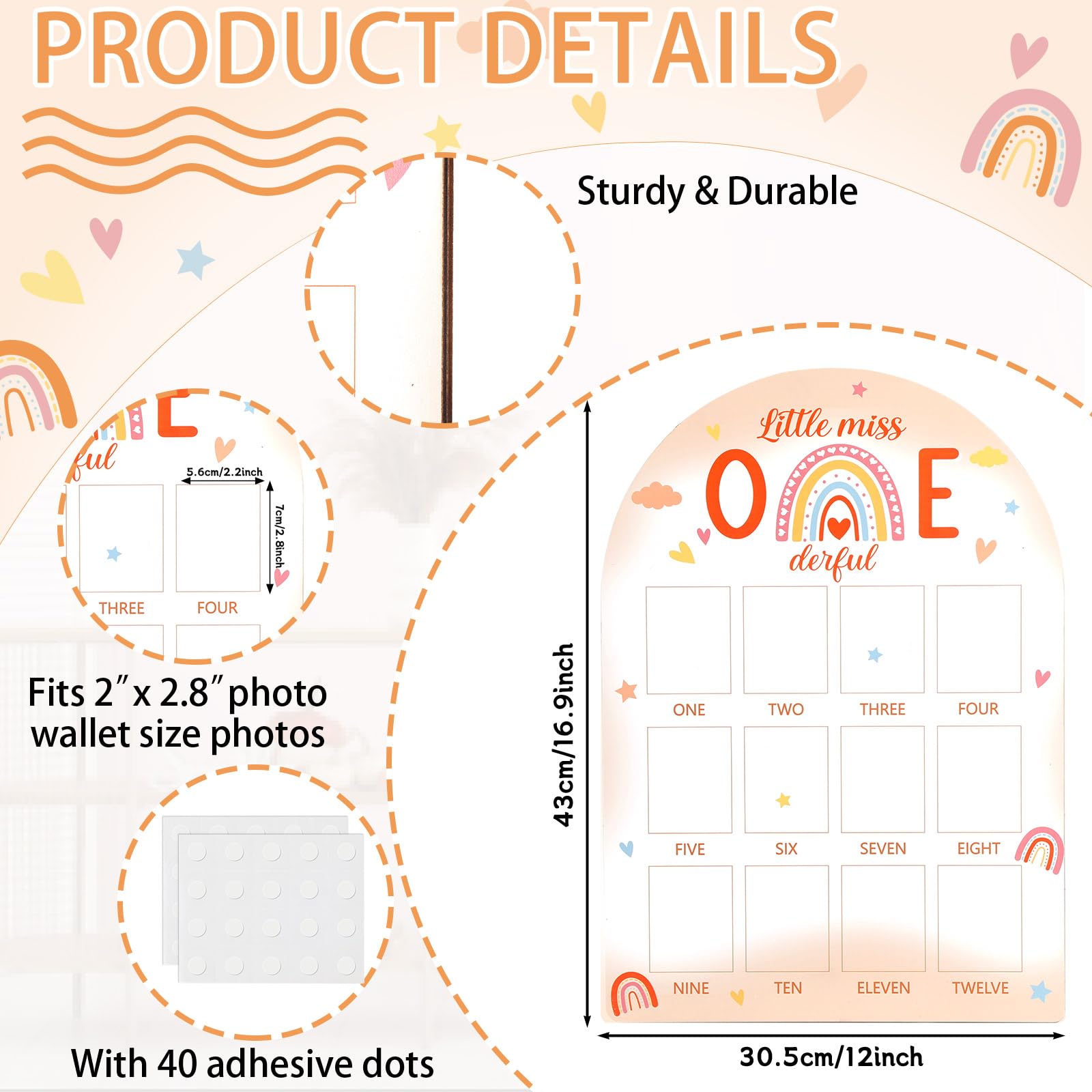 Little Miss One Derful Photo Board Boho Rainbow First Birthday Party Decor Wooden Board 12 Monthly Milestone Picture Frame One Year Old Wood Sign 1st Bday Photo Banner for Baby Keepsake Gift Supply This Little Miss One Derful Rainbow First Birthday Photo Board is a beautifully printed wooden milestone display designed to celebrate your baby’s first year in a warm boho style. Measuring 17 x 12 x 0.4 inches, it features smooth rounded corners, vibrant rainbow artwork, and space for 12 monthly photos to highlight your baby’s growth. Specifications: Material: wood Size: 16.9 x 12 x 0.4 inches Color: colorful Package Includes: 1 x boho rainbow themed milestone board 2 sheets of adhesive dots Each board includes two sheets of adhesive dots for easy photo mounting, making it ideal for birthday parties, memory books, nursery décor, or a long-lasting keepsake that captures your little one’s sweetest moments.