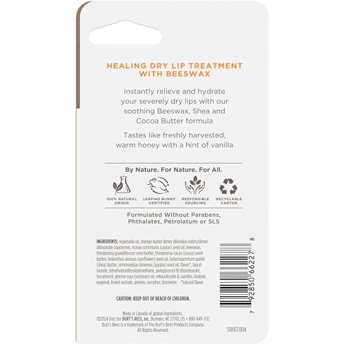 Burt's Bees Honey Vanilla Rescue Lip Relief Lip Balm instantly hydrates and replenishes extremely dry lips. Formulated with responsibly sourced beeswax, shea butter and cocoa butter, this lip moisturizer immediately relieves dryness and helps protect lips' natural moisture barrier. The lightweight, non-sticky beeswax formula is easy to wear, and it features the delicious taste of freshly harvested warm honey with a hint of vanilla. Formulated without parabens, phthalates, petrolatum or SLS, this moisturizing lip balm is 100% natural origin to rejuvenate and beautify lips with clean ingredients. For relief of dry lips no matter where you are, just tuck a tube of this natural origin lip balm into your pockets or purse to keep nurturing lip care at your fingertips. Use Burt's Bees Lip Balm to make lips feel their best. Burts Bees is the No. 1 dermatologist-recommended natural skin care brand (1). (1) Based on a November 2023 NielsenIQ national survey of U.S. Dermatologists
