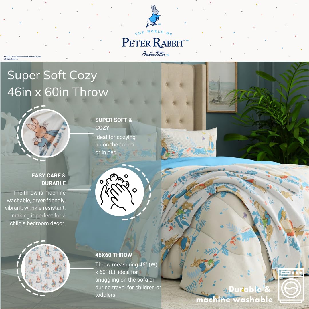 ITEM INCLUDES: Included is super soft Peter Rabbit throw measuring 46" (W) x 60" (L). Perfectly sized to snuggle-up on the sofa at naptime for children or toddlers while traveling.