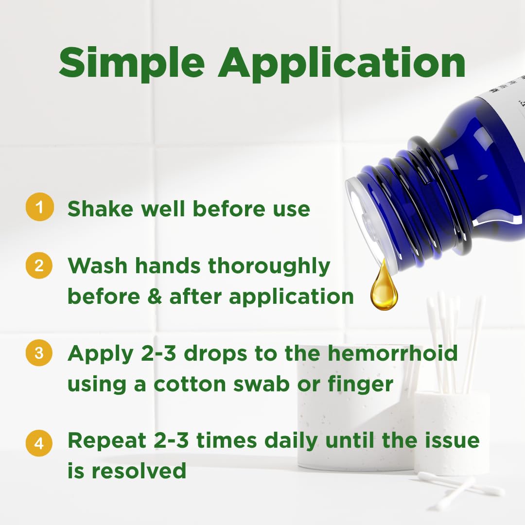 HOW TO USE: For hemorrhoid pain and discomfort. Shake well then apply 2-3 drops directly to problem area using a cotton swab or finger. Repeat this process 2-3 times daily until the issue is resolved. Wash your hands thoroughly before and after each application.