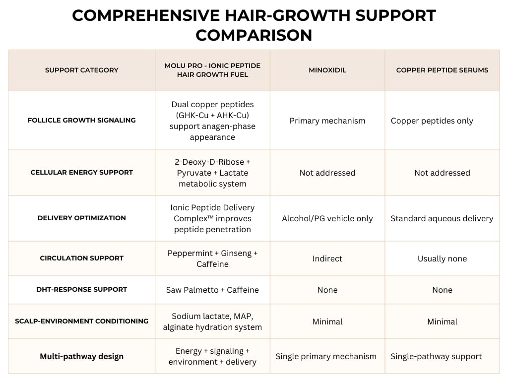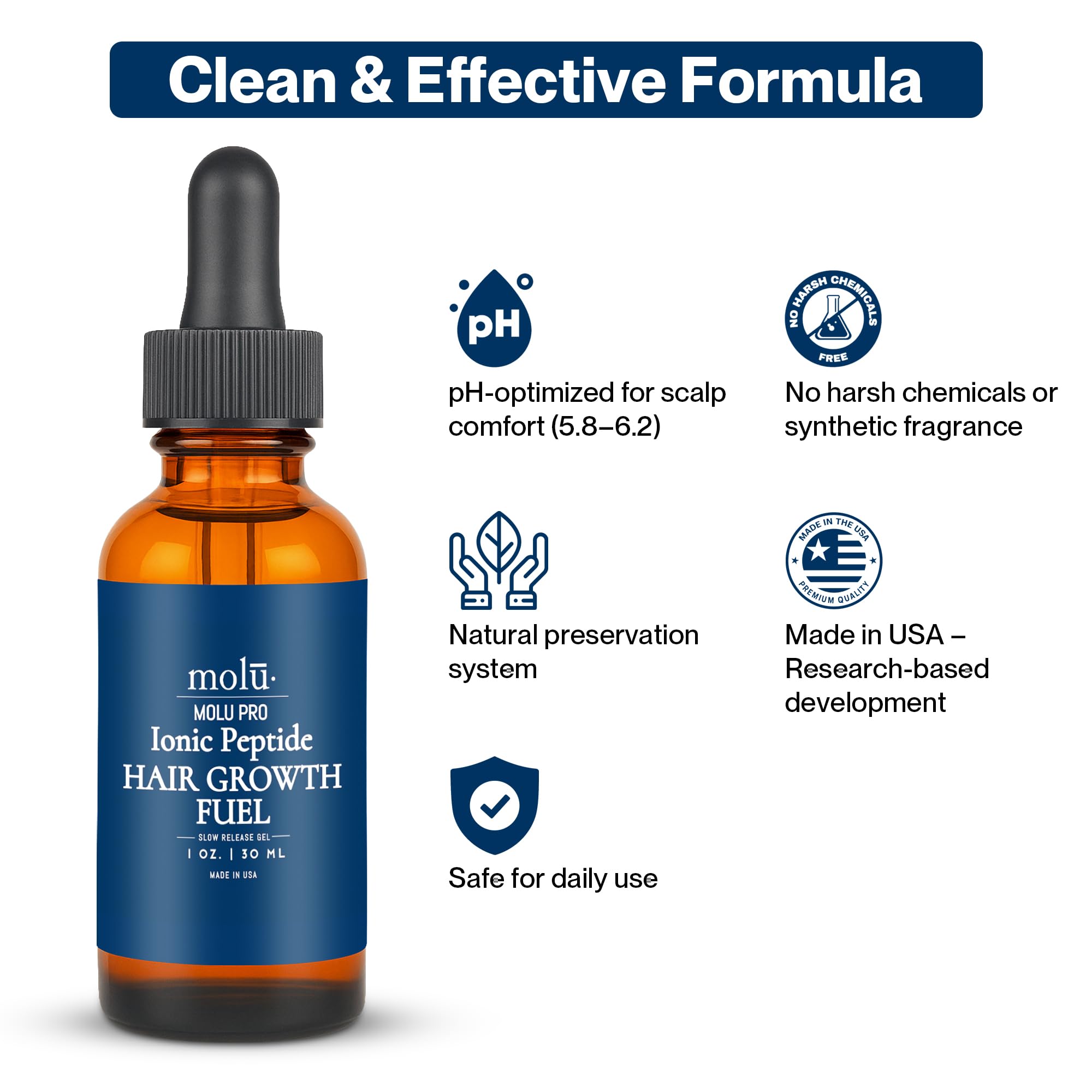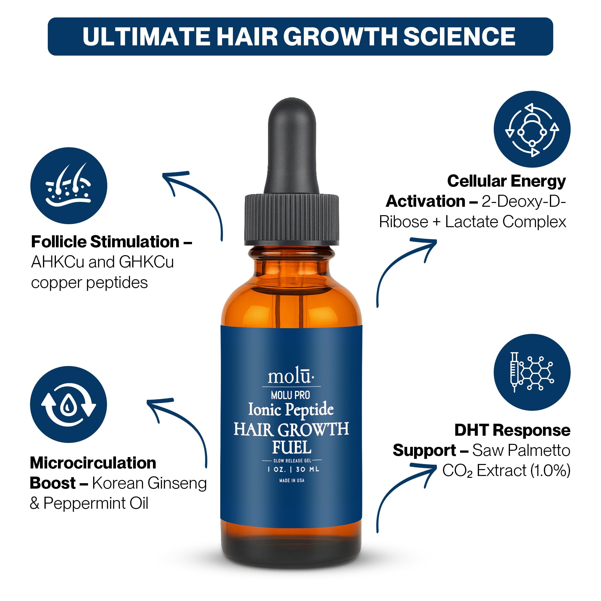 Molu Pro Ionic Peptide Hair Growth Fuel A daily scalp serum formulated with 0.1% dual copper peptides—0.05% GHK-Cu and 0.05% AHK-Cu—and the Ionic Peptide Delivery Complex, a plant-derived ionic system designed to encapsulate peptides and enhance absorption across the skin's surface. This revolutionary formula supports follicle performance across energy, growth signaling, and scalp environment for the look of thicker, fuller hair. Formulated across three key pathways: Copper peptides for the appearance of density and thickness 2-Deoxy-D-Ribose (2dDR) for scalp energy support Sodium Lactate & Pyruvate Complex for metabolic and conditioning support Also features Saw Palmetto CO₂, Caffeine, Ginseng, and Peppermint Oil. Free from heavy silicones and synthetic fragrance. pH-balanced at 5.8–6.2. How to use: Apply 10–15 drops to a clean, dry scalp, massage for 60 seconds, and allow to absorb. Use 1–2× daily for best results.