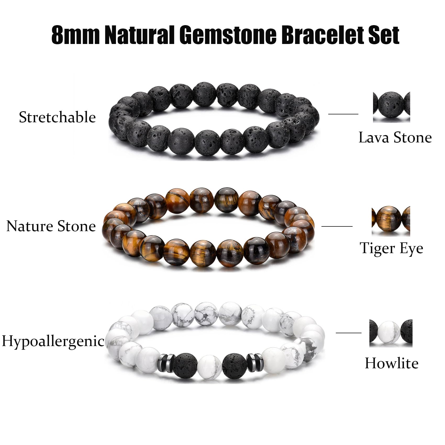 Mens Bracelets Size:The tiger eye stone and black matte agate stone bracelet can Stretch,Bead size:8mm,Adjustable Range: 7.3''-10.4''. Perfect sizes as gemstone bracelet for both men and women UNISEX. Natural tiger eye mens bracelet is a perfect bracelet jewelry accessory for any occasion to change your style and mood.