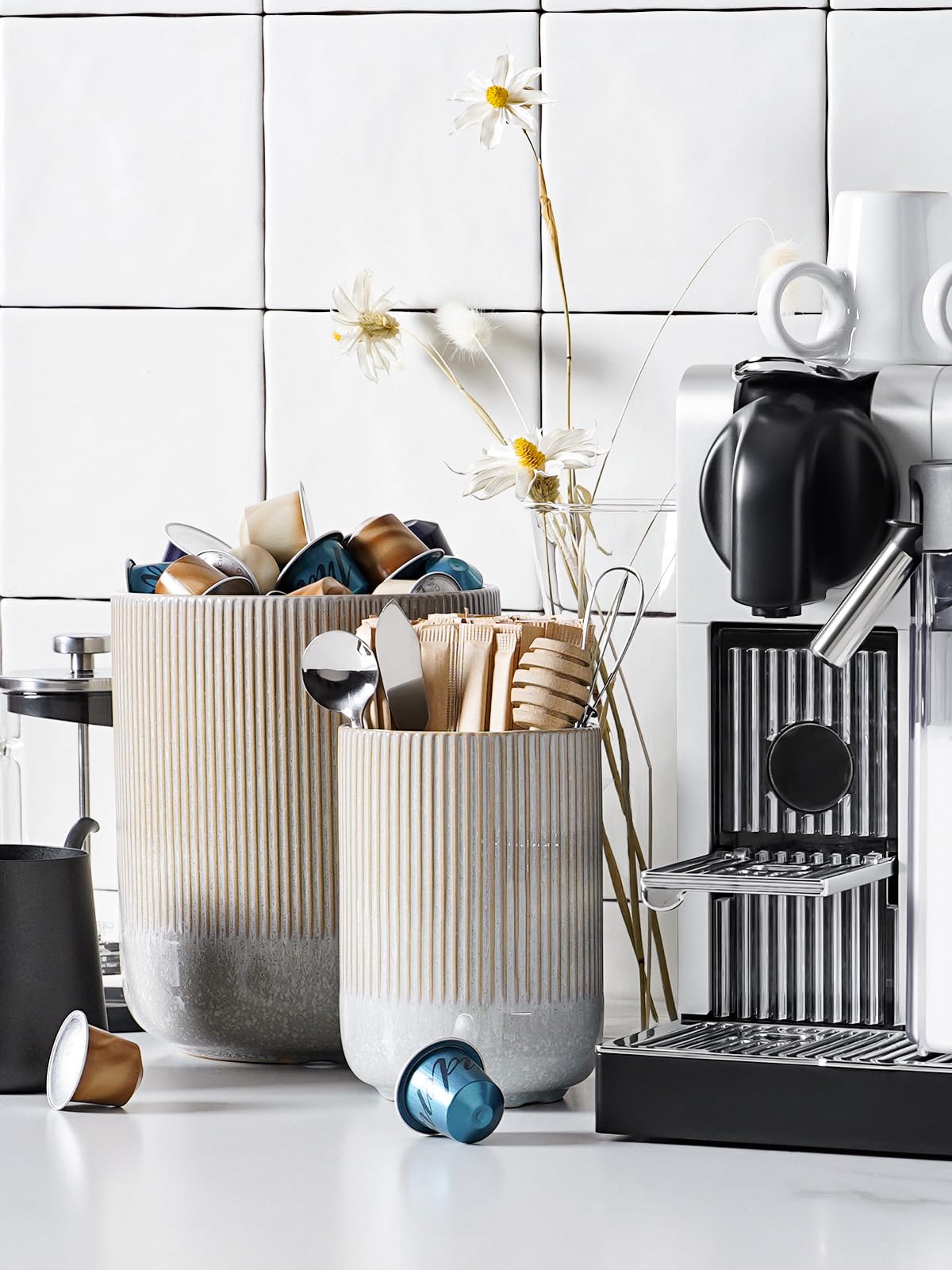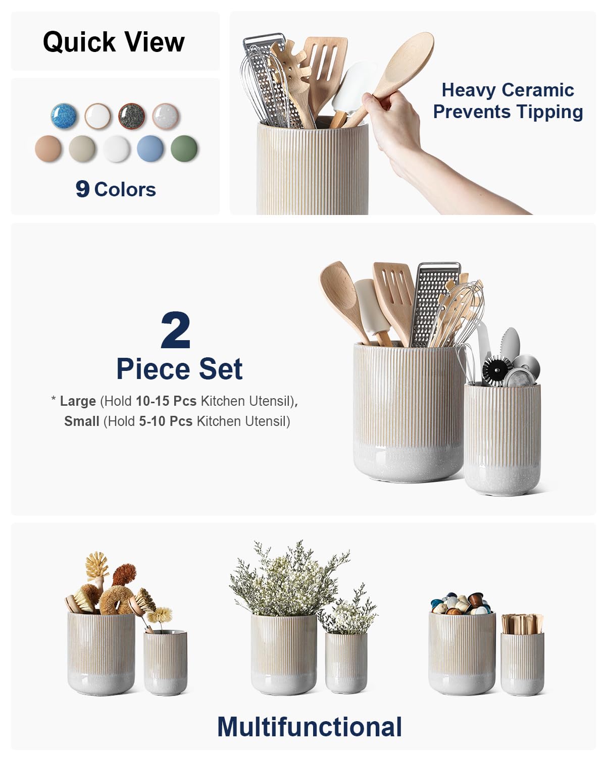 Thoughtfully Sized, Set of 2: Our utensil holder set includes 2 carefully proportioned holders for your kitchen accessories; The larger holder, measuring H7.3" x D6", is designed to comfortably store around 15 spatulas or utensils; The smaller holder, at H5.4" x D3.8", is suited for the organized arrangement of up to 10 sets of flatware; Say hello to a well-organized cooking space